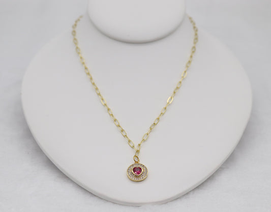 Gold Heart Pendant Necklace – Red Gemstone Center with Crystal Halo