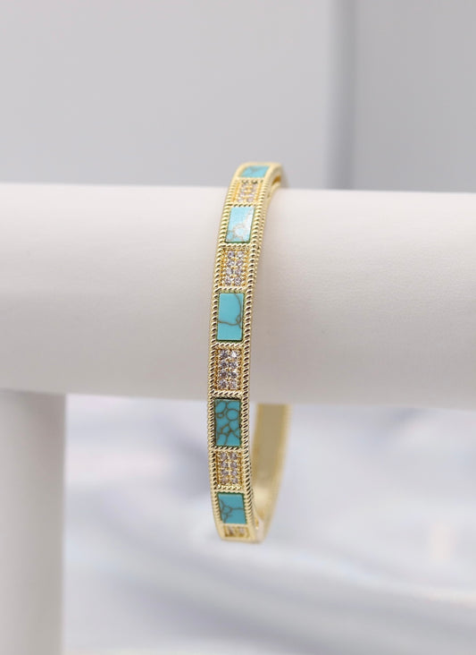 Gold Hinge Bangle Braclet With Turquoise And CZ Paved Stations