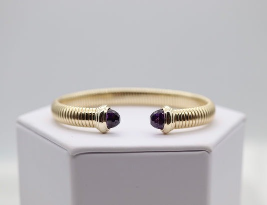 Gold Tubogas Cuff Bracelet With Violet Crystal Ends
