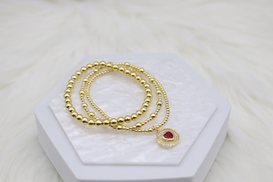 Triple Layered Gold Beaded Bracelet With Red Heart Dangling Pendant