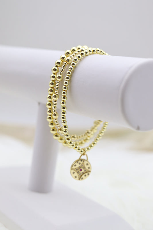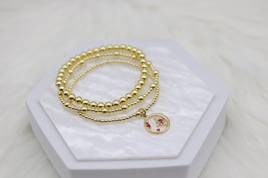 Triple Layered Gold Beaded Bracelet With Red Diamond Star Dangling Pendant