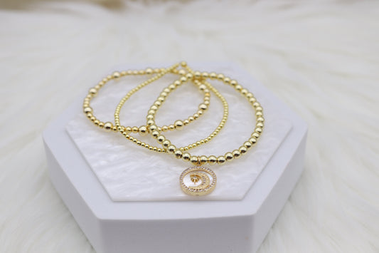 Triple Layered Gold Beaded Bracelet With Half Moon Dangling Pendant