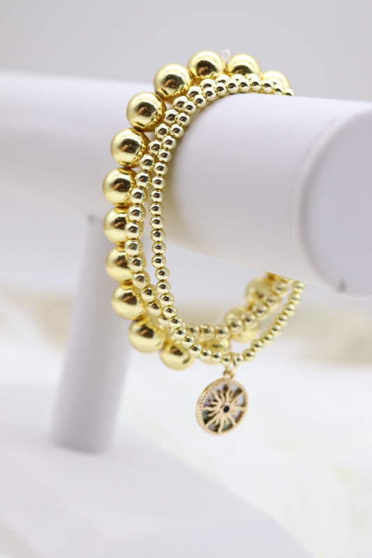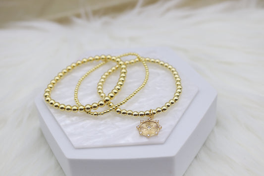 Triple Layered Gold Beaded Elastic Bracelet With Starburst Dangling Pendant