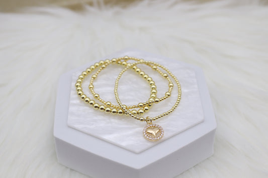 Triple Layered Gold Beaded Bracelet With Heart Dangling Pendant