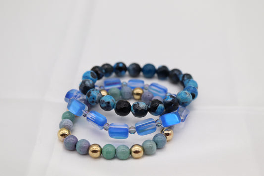 Gold Blue Purple Glass Stone Bead Bracelet Set