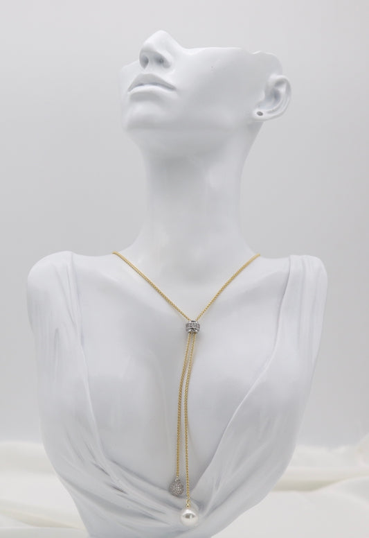 Gold Tone Lariat Necklace with Pearl Drop & Crystal Accent