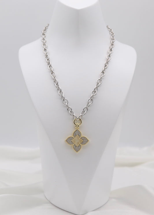 Two-Tone Clover Filigree Pendant Necklace – Silver Chain with Gold Detail