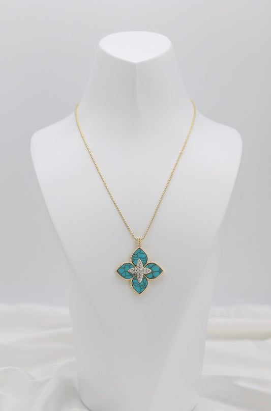 Turquoise Clover Statement Pendant Necklace – Gold Tone with Crystal Center