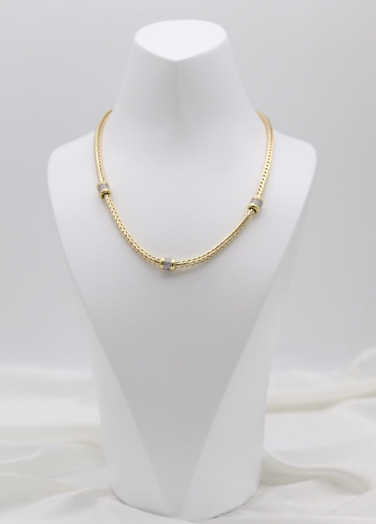 Gold Tone Woven Collar Necklace with Crystal Accent Rings