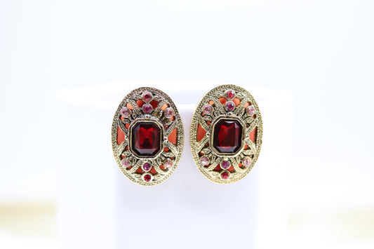 Enameled Renaissance Style With Fine Ruby Red CZ Pendant Oval Necklace With Matching Clip On Earrings