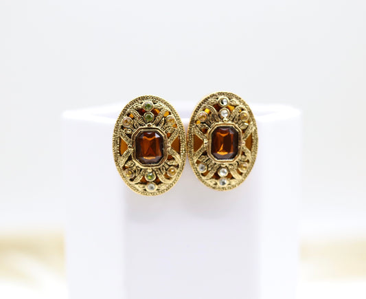 Enameled Renaissance Style With Fine Light Brown CZ Pendant Oval Necklace With Matching Clip On Earrings