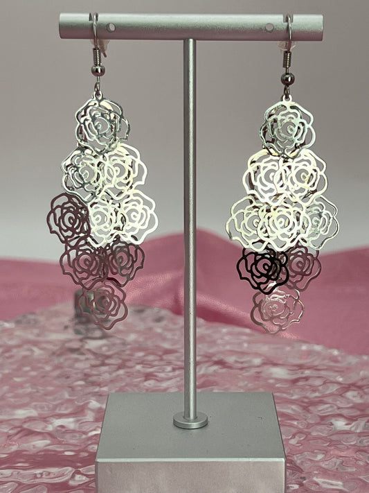 Bohemian Multi Layered Filigree Flower Dangle Drop Long Statement Earrings, Silver