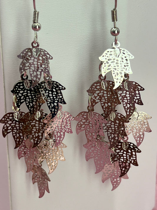 Bohemian Multi Layered Filigree Maple Leaves Dangle Drop Long Statement Earrings, Silver