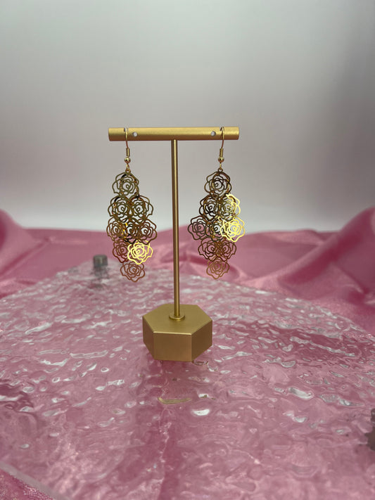Bohemian Multi Layered Filigree Flower Dangle Drop Long Statement Earrings, Gold