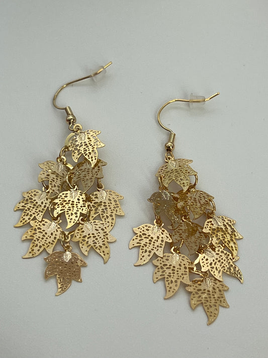 Bohemian Multi Layered Filigree Maple Leaves Dangle Drop Long Statement Earrings, Gold
