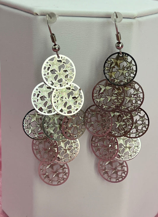 Bohemian Multi Layered Filigree Cut Out Star Circles Dangle Drop Long Statement Earrings, Silver