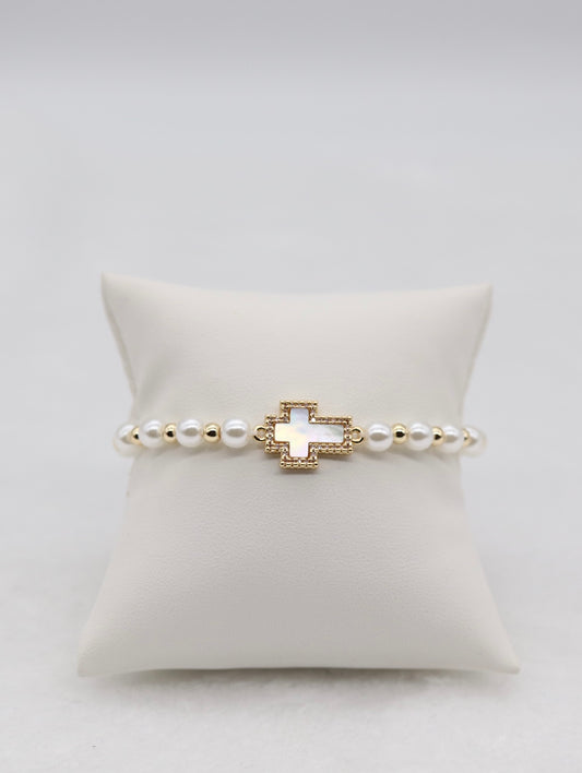 Mother of Pearl Cross & Pearl Beaded Bracelet – Faithful Elegance