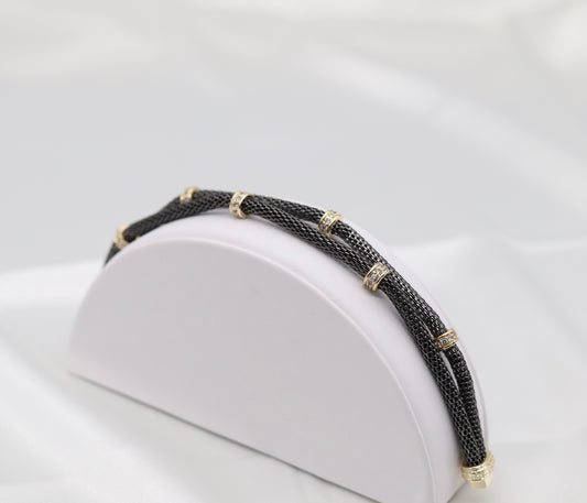 Gold Mesh-Chain Bracelet with Round Black Trim CZ Stations