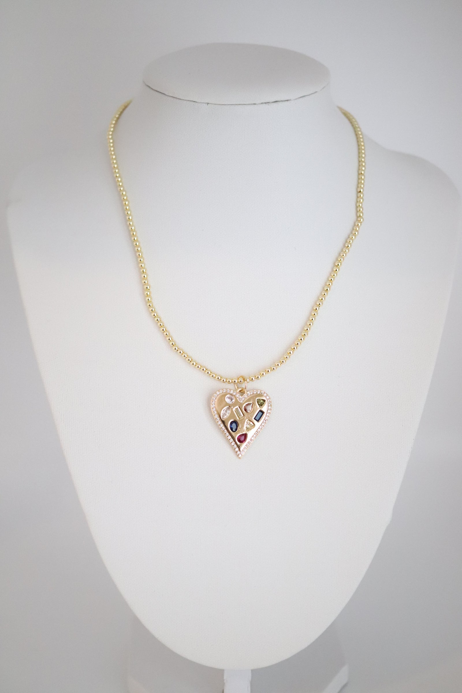 A Gold Beaded Necklace with Heart Pendant combines timeless elegance with a touch of romance, featuring a string of gold beads leading to a heart-shaped pendant. This accessory adds a sweet and sophisticated element to any outfit, making it a versatile and sentimental piece of jewelry.