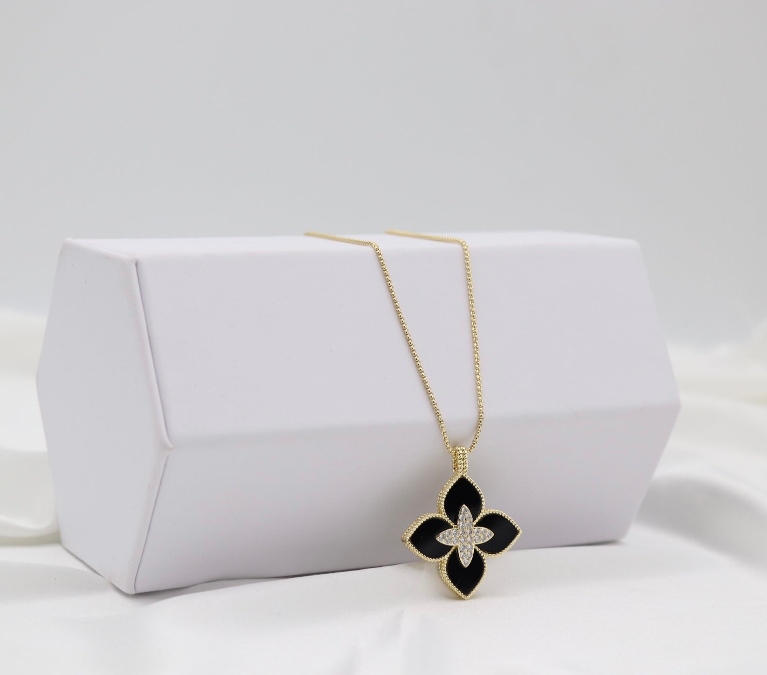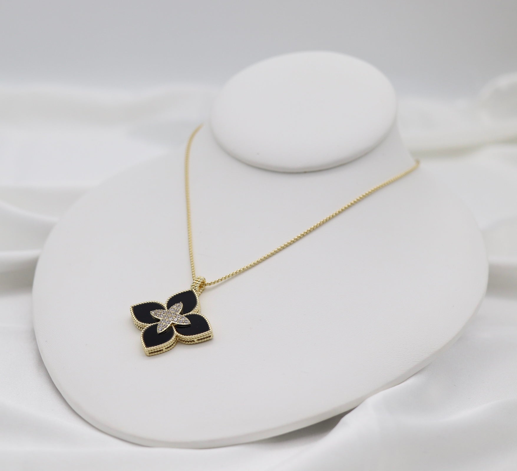 Make a bold yet elegant statement with this black clover pendant necklace, designed to bring effortless sophistication to any look. The four-petal clover design features deep black enamel-style inlay framed in gold tone, with a sparkling crystal center that catches the light beautifully. Suspended from a sleek gold tone chain, this piece is perfect for both everyday wear and dressy occasions. A standout addition to your TGI Jewelry collection, this necklace layers beautifully or shines on its own as a signature piece.