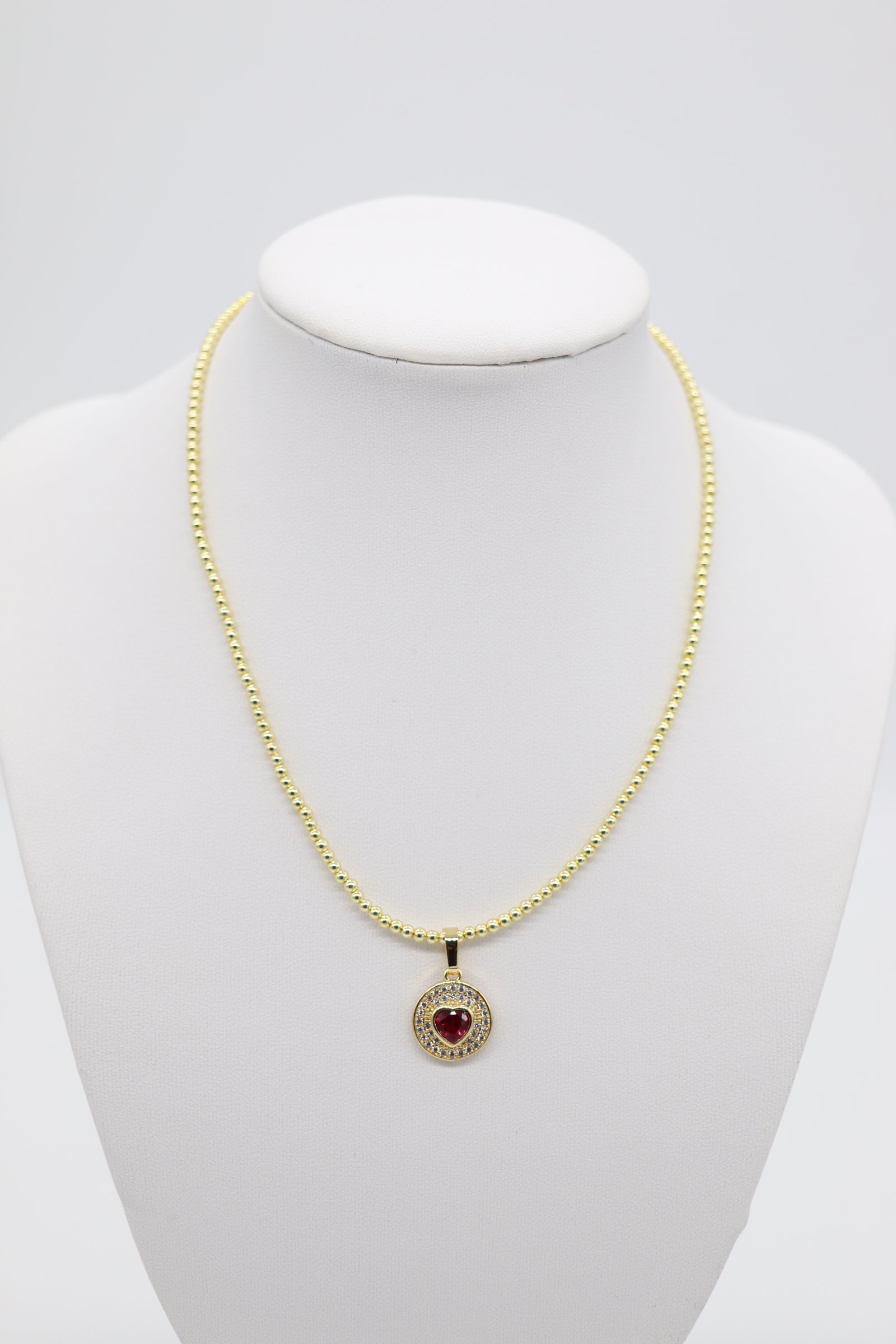 Gold Beaded Necklace With Red Heart Pendant (3mm)