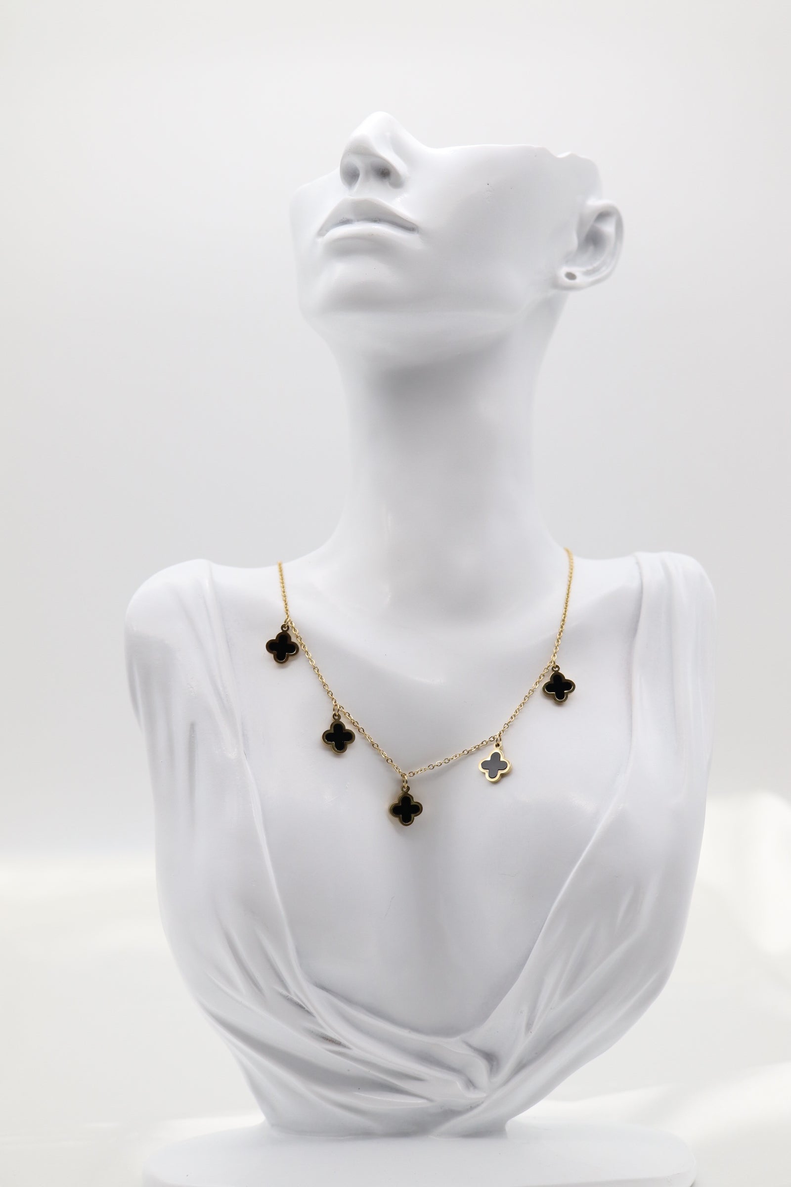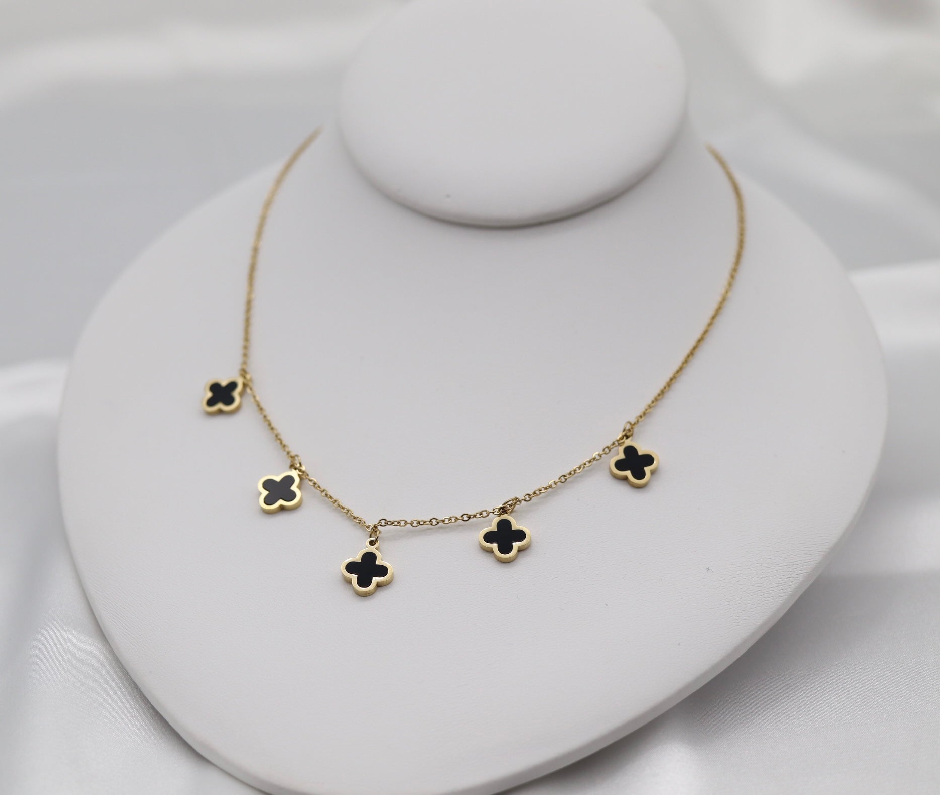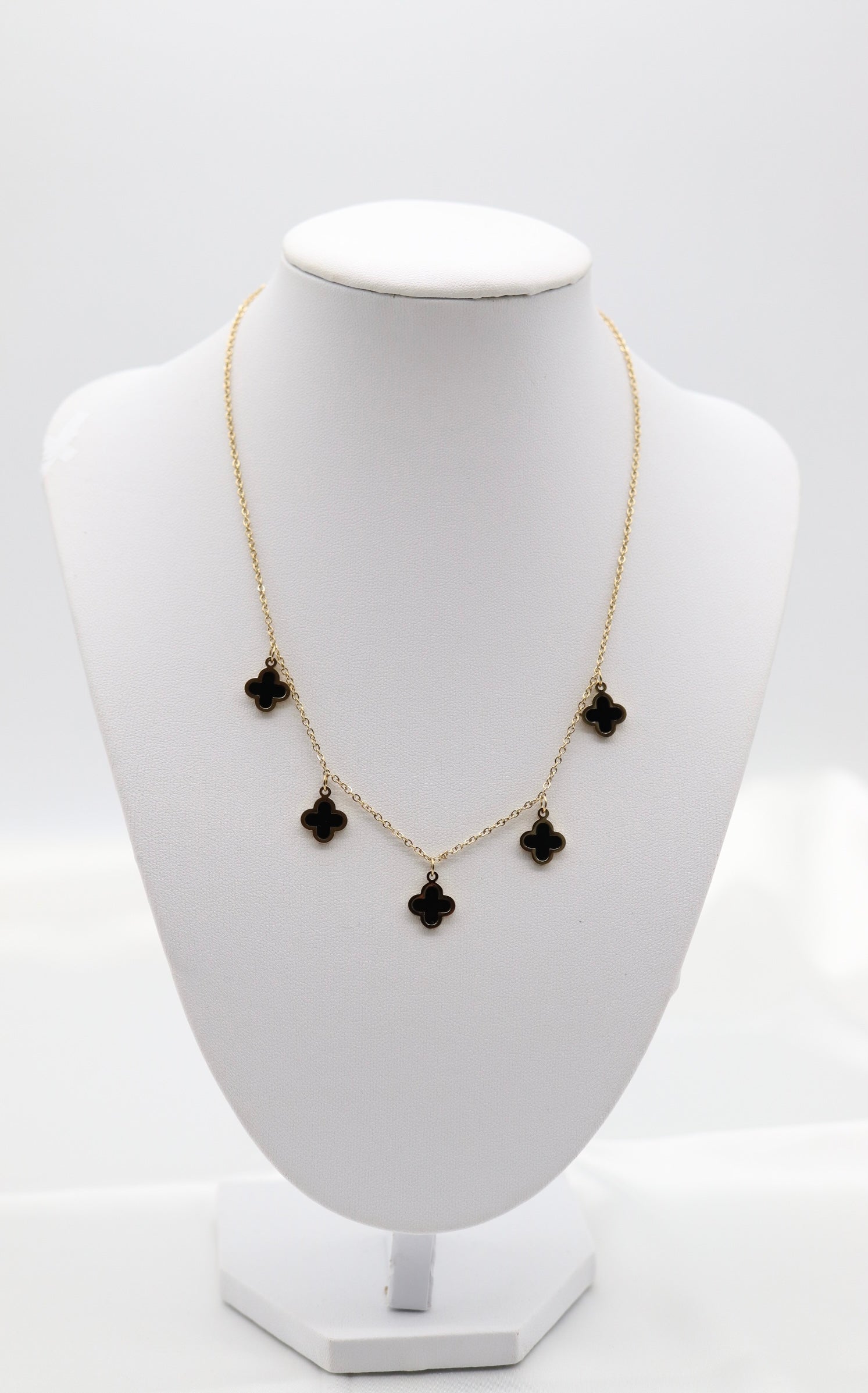 A clover necklace with a sleek black clover design, exuding a modern and minimalist charm. The black clover pendant adds a subtle yet distinctive touch, making it a stylish and versatile accessory for various occasions.