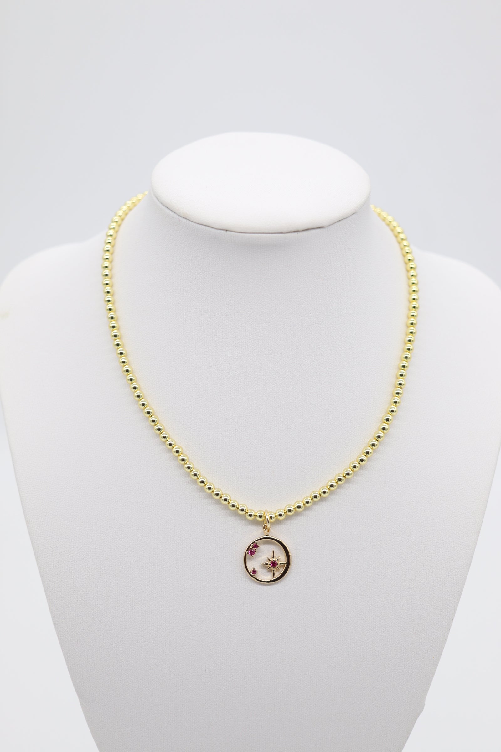 This elegant necklace features a delicate 4mm gold beaded chain with a striking star pendant. Handcrafted and designed by expert artisans, this necklace adds a touch of sophistication to any outfit. The timeless design and high-quality materials make it the perfect addition to your jewelry collection.