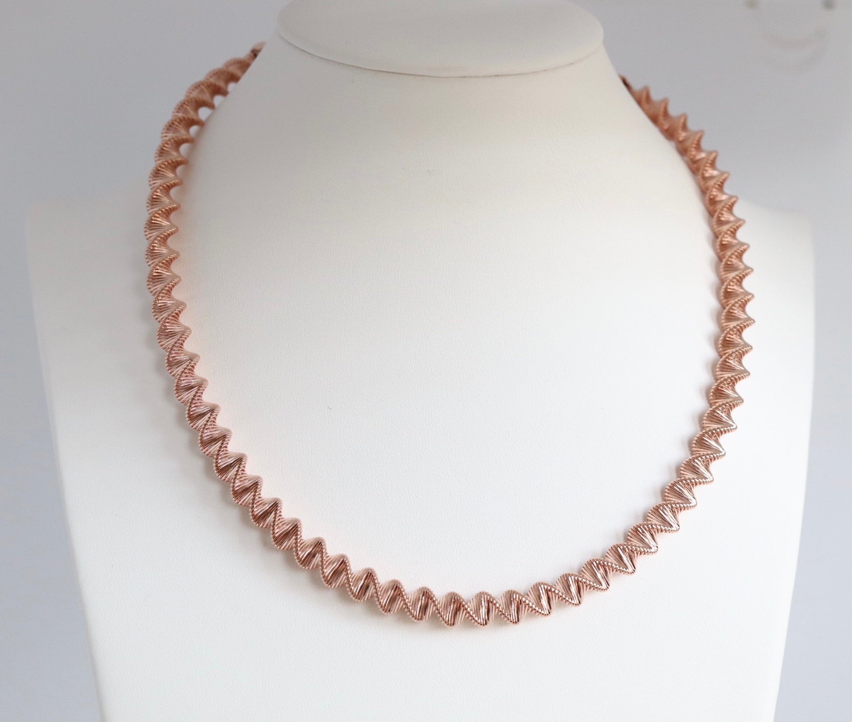 This necklace is made of rose gold, which is a beautiful and unique color. It is also elastic, which means that it will stretch to fit your neck. The necklace is a beautiful and unique piece of jewelry that you will love to wear.
