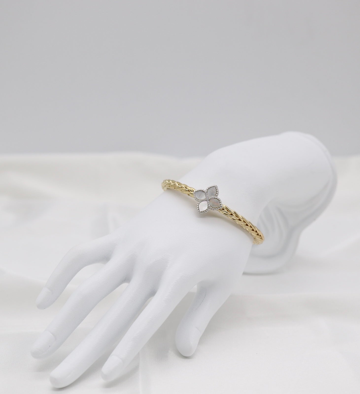 This elegant gold-tone cuff features a beautifully braided design accented with a delicate clover centerpiece and subtle sparkle. Timeless and feminine, it’s the perfect statement bracelet for everyday wear or special occasions.