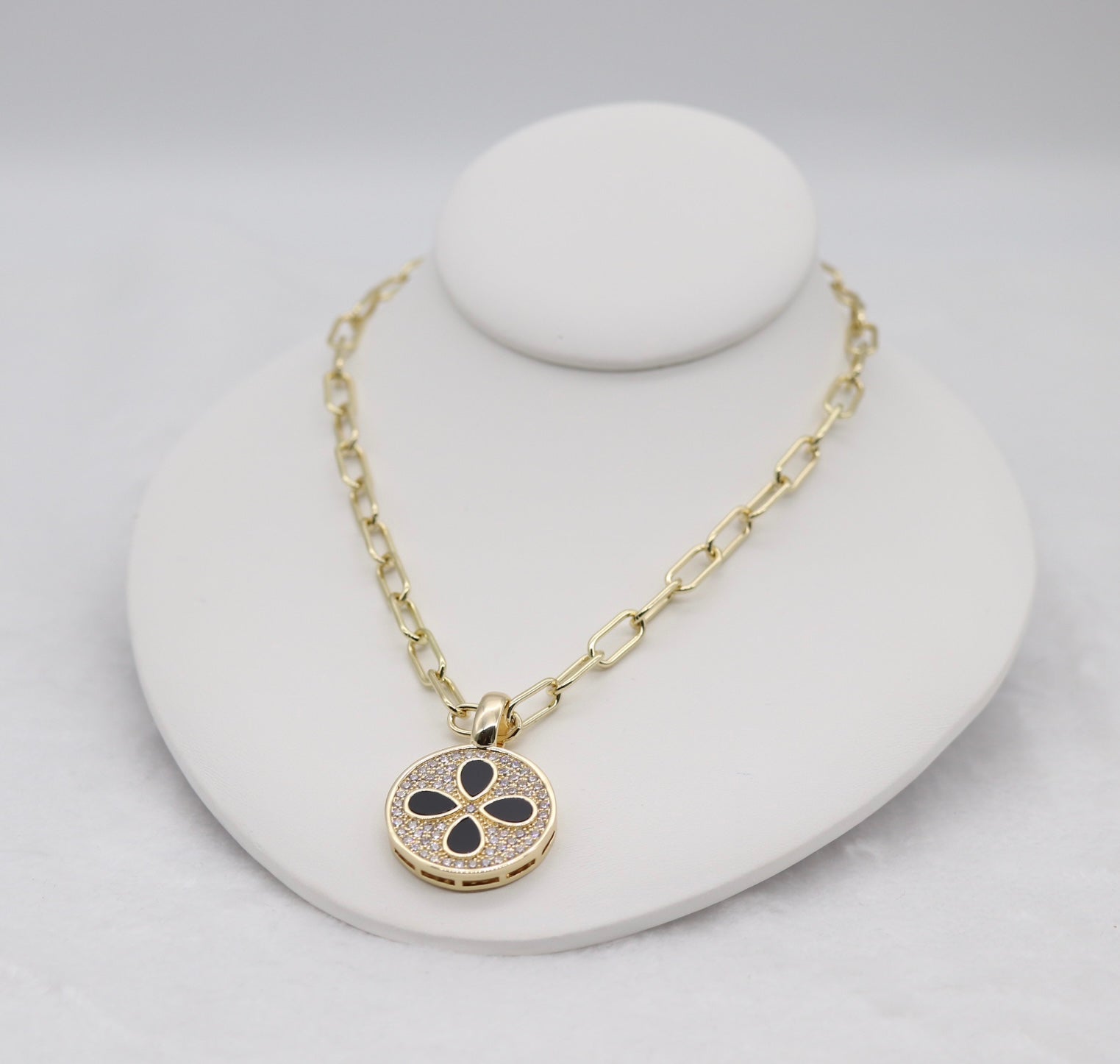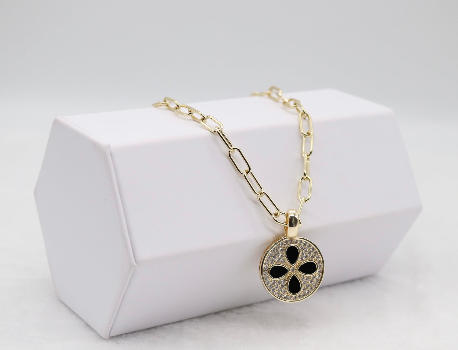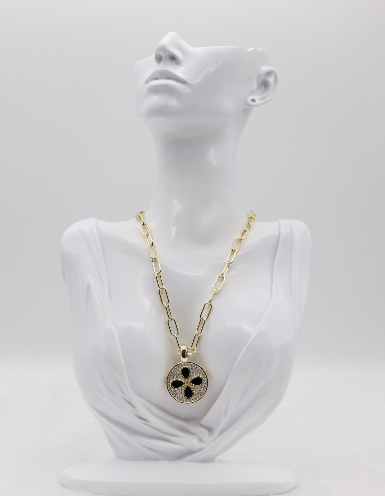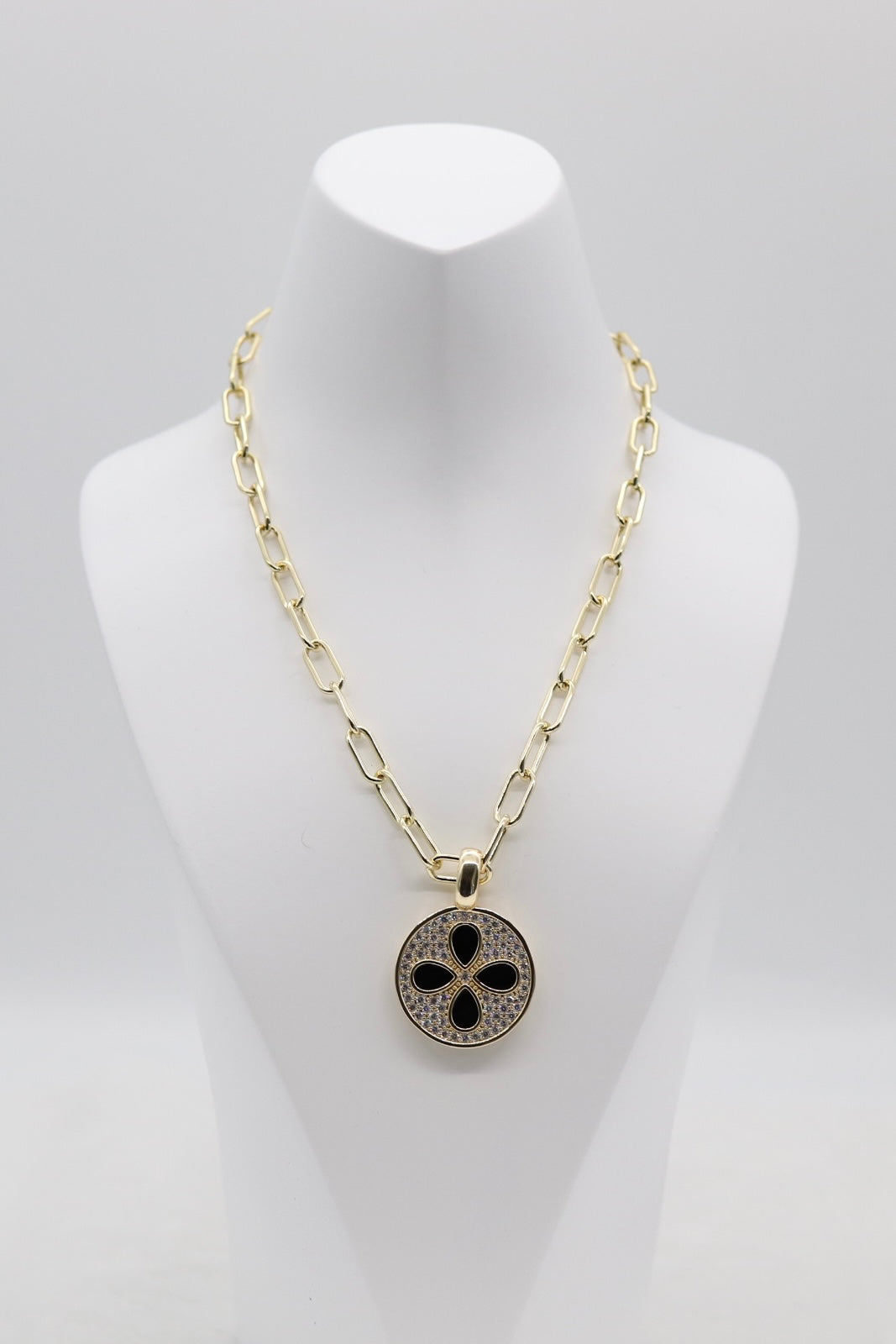 This bold gold chain necklace features a striking round medallion pendant accented with a black clover design and shimmering pavé crystals. A perfect mix of elegance and modern edge, it’s an eye-catching accessory that elevates both casual and dressy looks.
