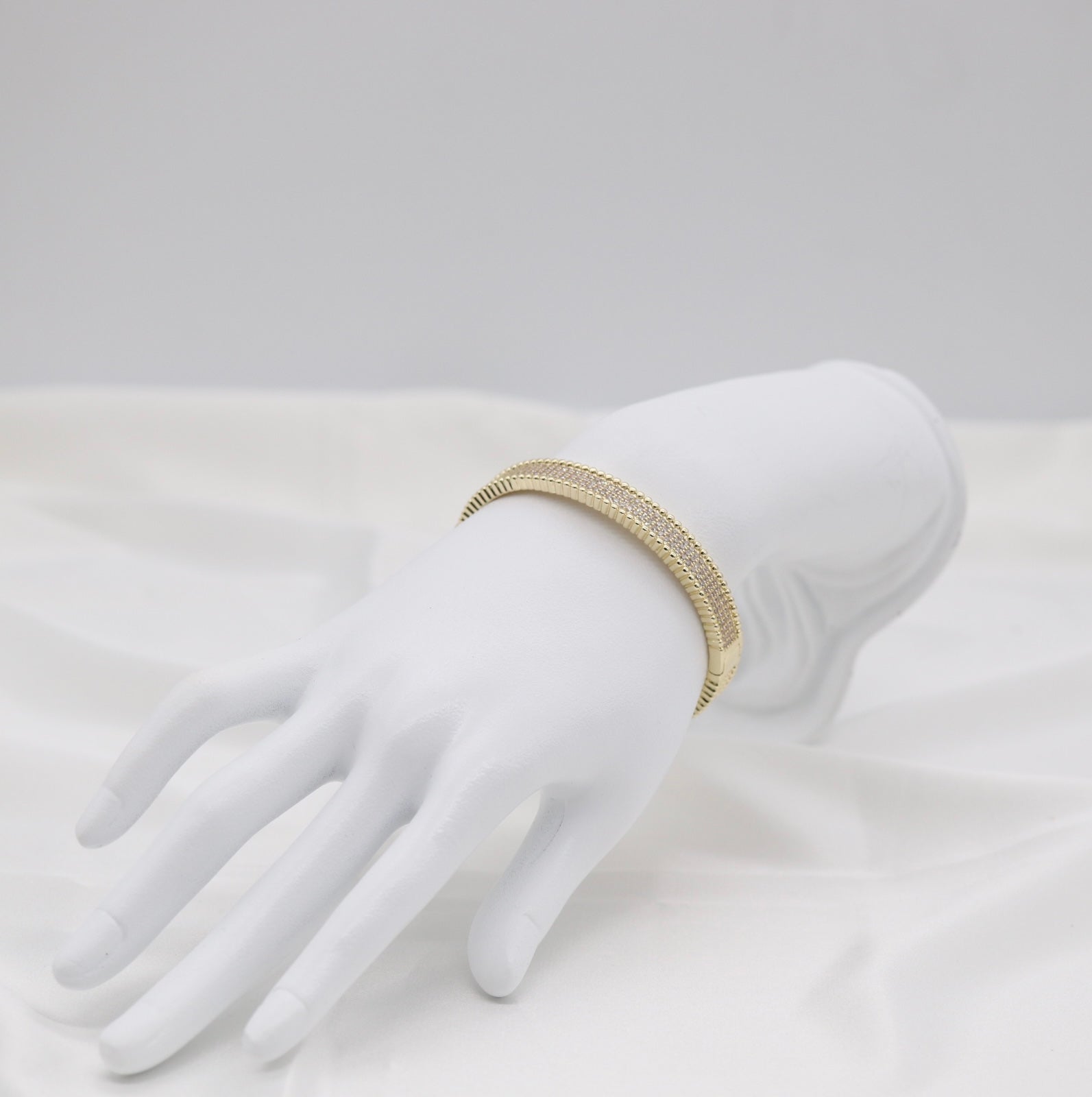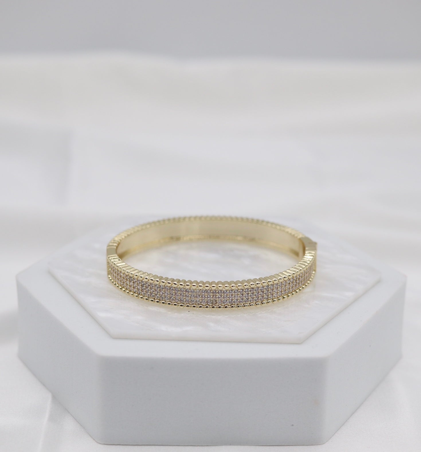 This refined gold-tone bangle features rows of shimmering pavé crystals framed by delicate beaded detailing. Elegant and versatile, it’s a timeless piece that adds effortless sparkle to both everyday and dressy looks.