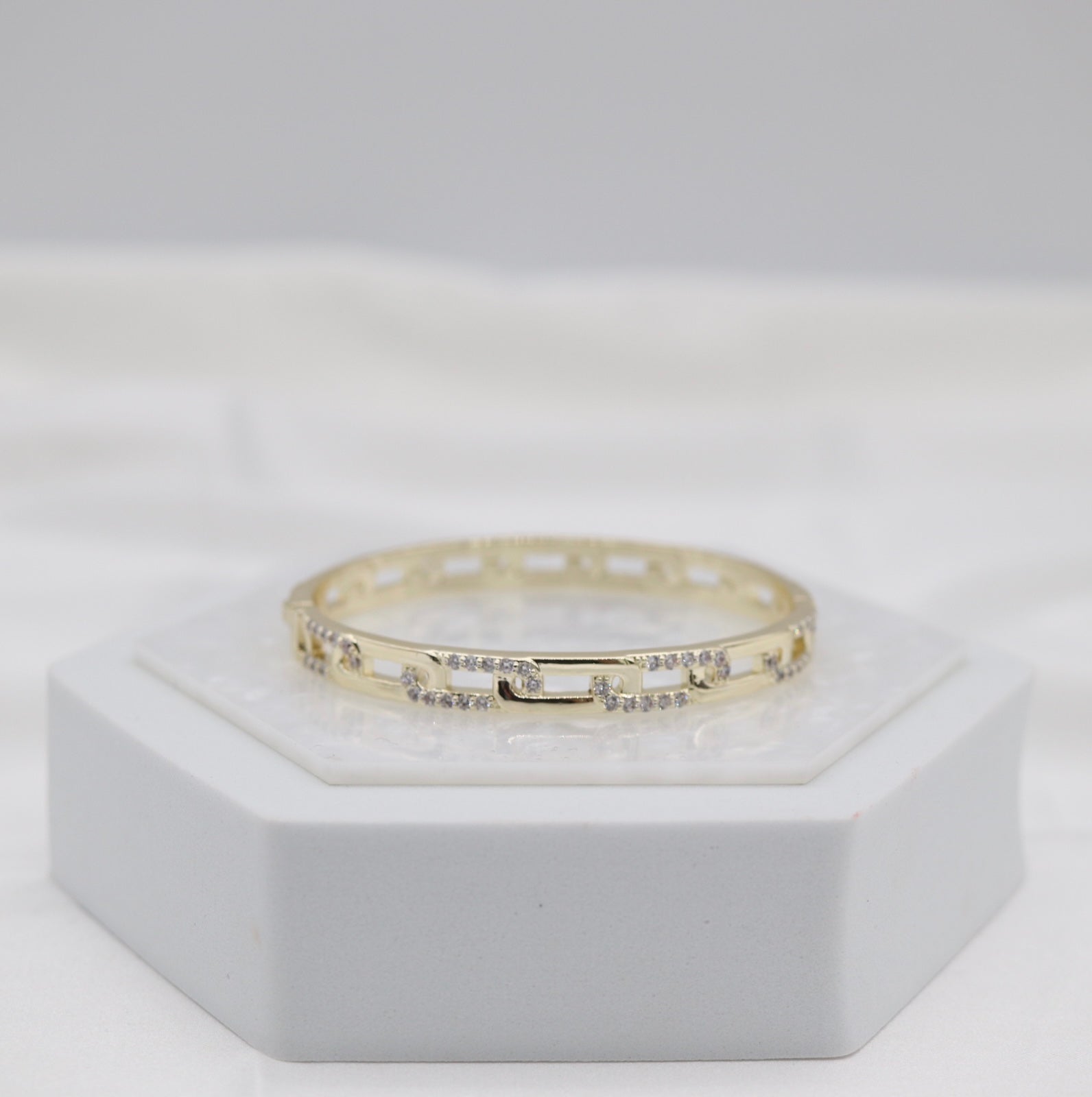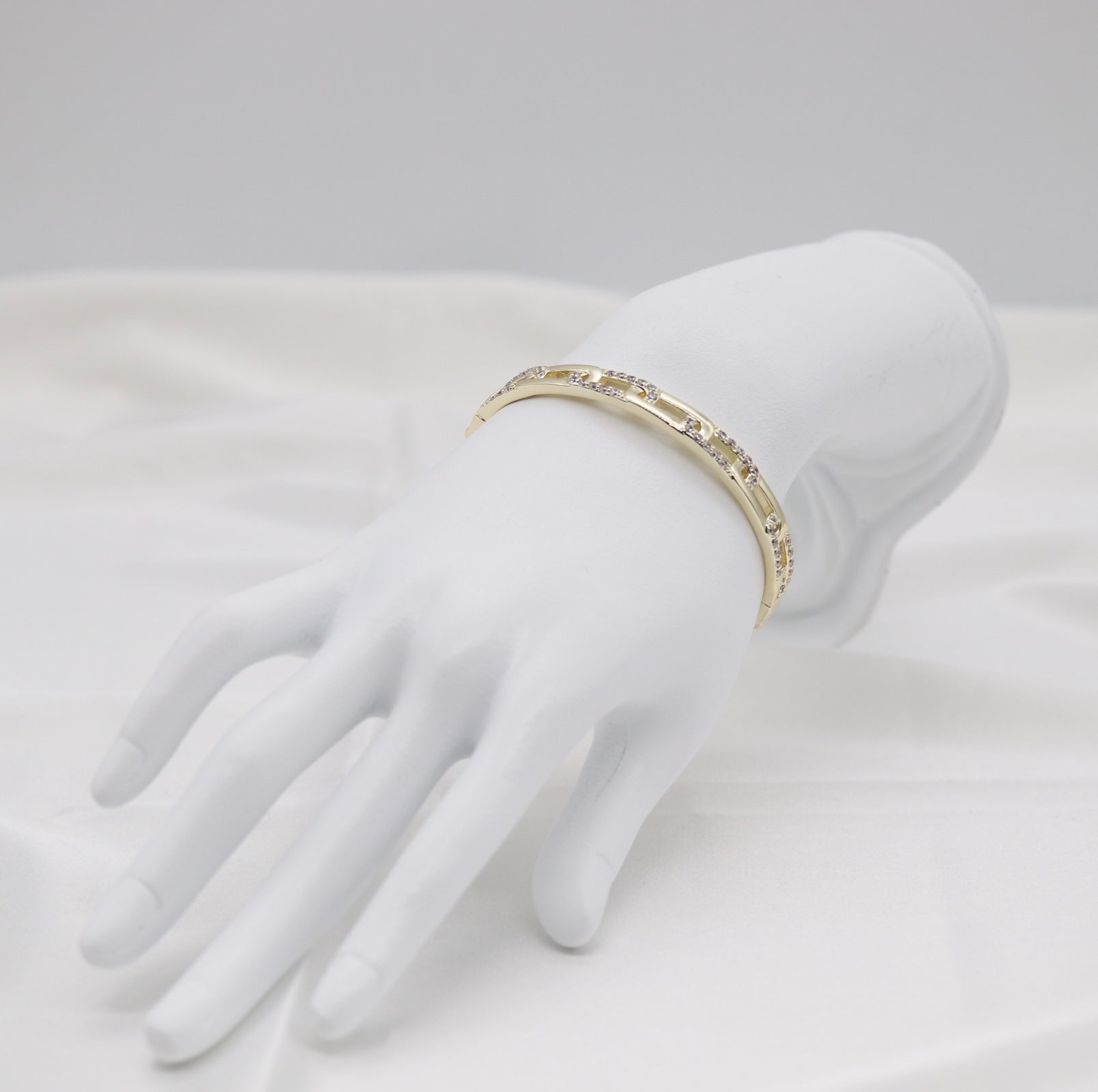 This sleek gold-tone bangle features a modern open-link design accented with shimmering pavé crystals for subtle sparkle. Polished and contemporary, it’s a versatile statement piece that transitions effortlessly from everyday wear to evening looks.