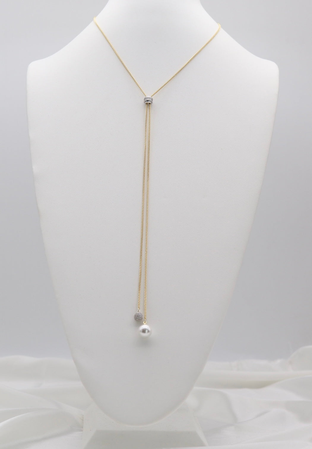 Delicate and modern with a graceful drop silhouette, this gold tone lariat necklace features a sleek chain design with a crystal-accent slider bead and two elegant dangling ends. One drop is finished with a pavé-style crystal sphere, while the other features a luminous pearl-style bead for a beautiful mixed-texture look. The adjustable lariat style lets you customize the drop length, making it perfect for layering or wearing as a refined statement piece. A versatile and feminine addition to your TGI Jewelry collection, this necklace pairs effortlessly with V-necks, dresses, and evening styles.