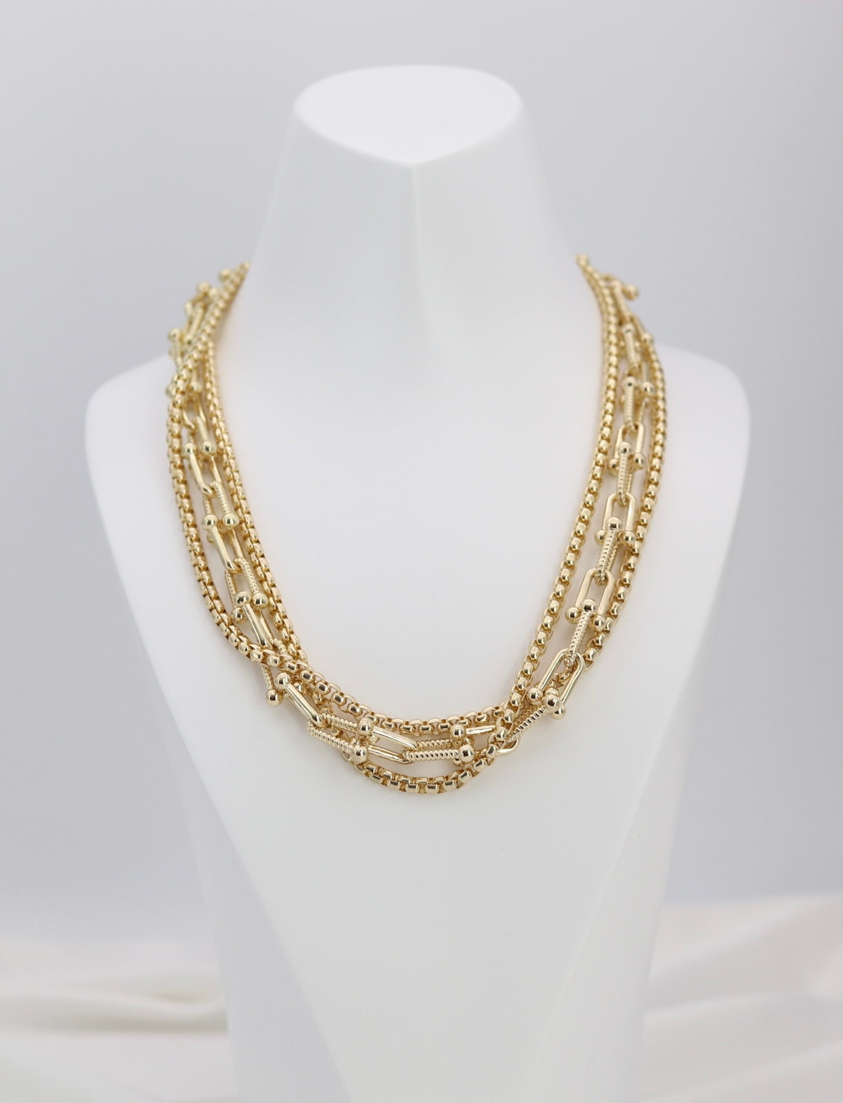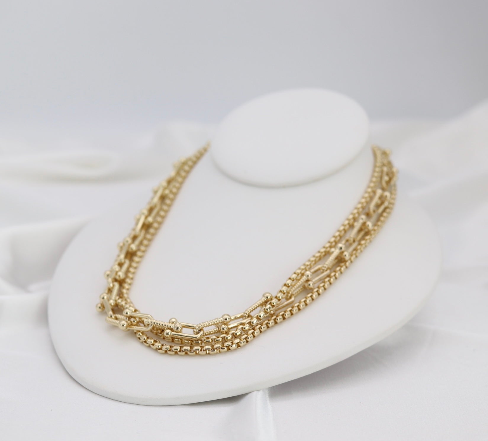 This stunning statement necklace features a rich blend of layered gold-tone chains accented with delicate bead detailing and mixed-link textures, creating a beautifully balanced, high-end look. The intricate combination of chains adds depth, movement, and shine, giving the piece a bold yet refined presence. Designed for women who love standout jewelry that still feels elegant, this necklace is perfect for elevating everyday outfits or making a statement at special events. It layers effortlessly and delivers a polished, boutique-luxury aesthetic.