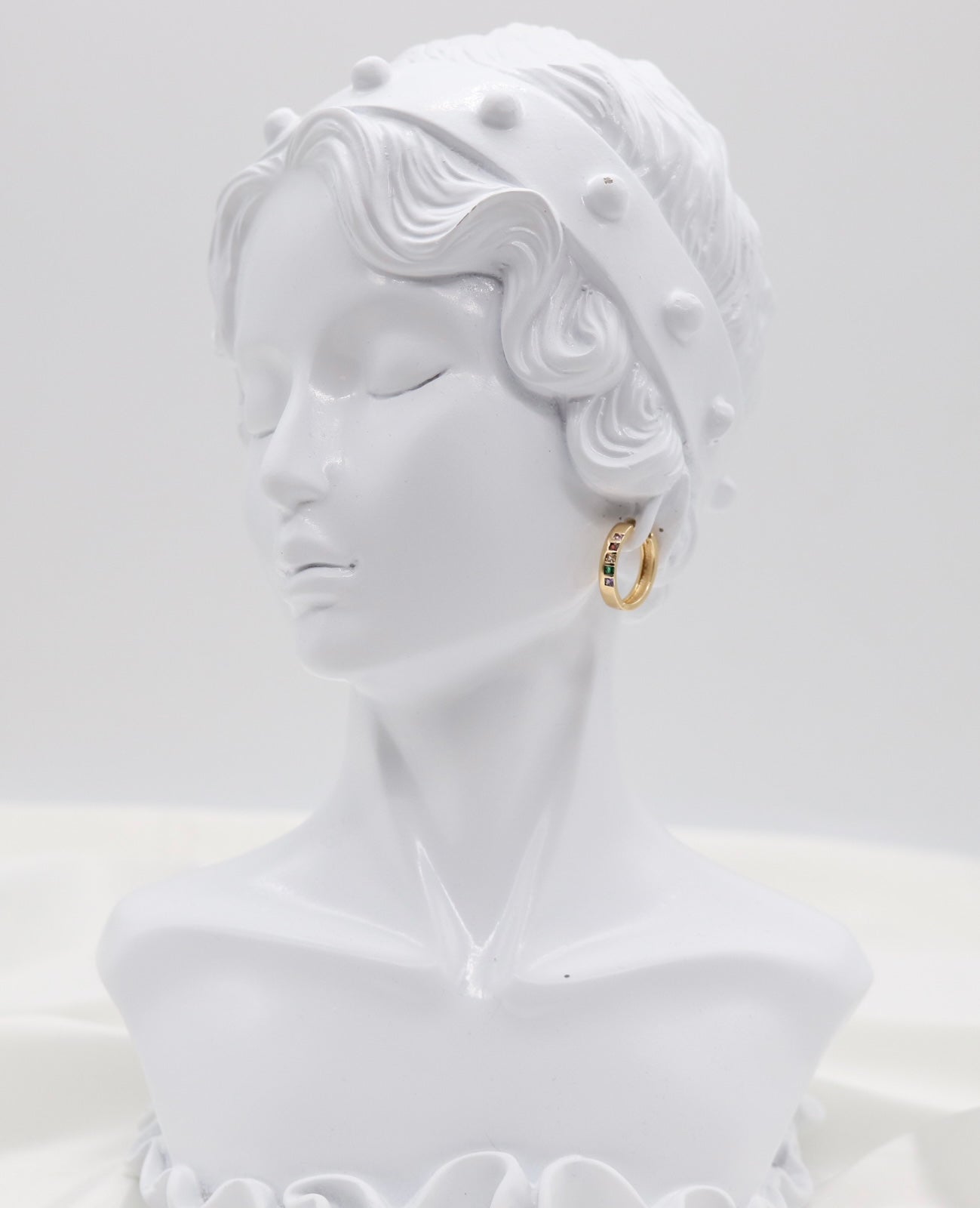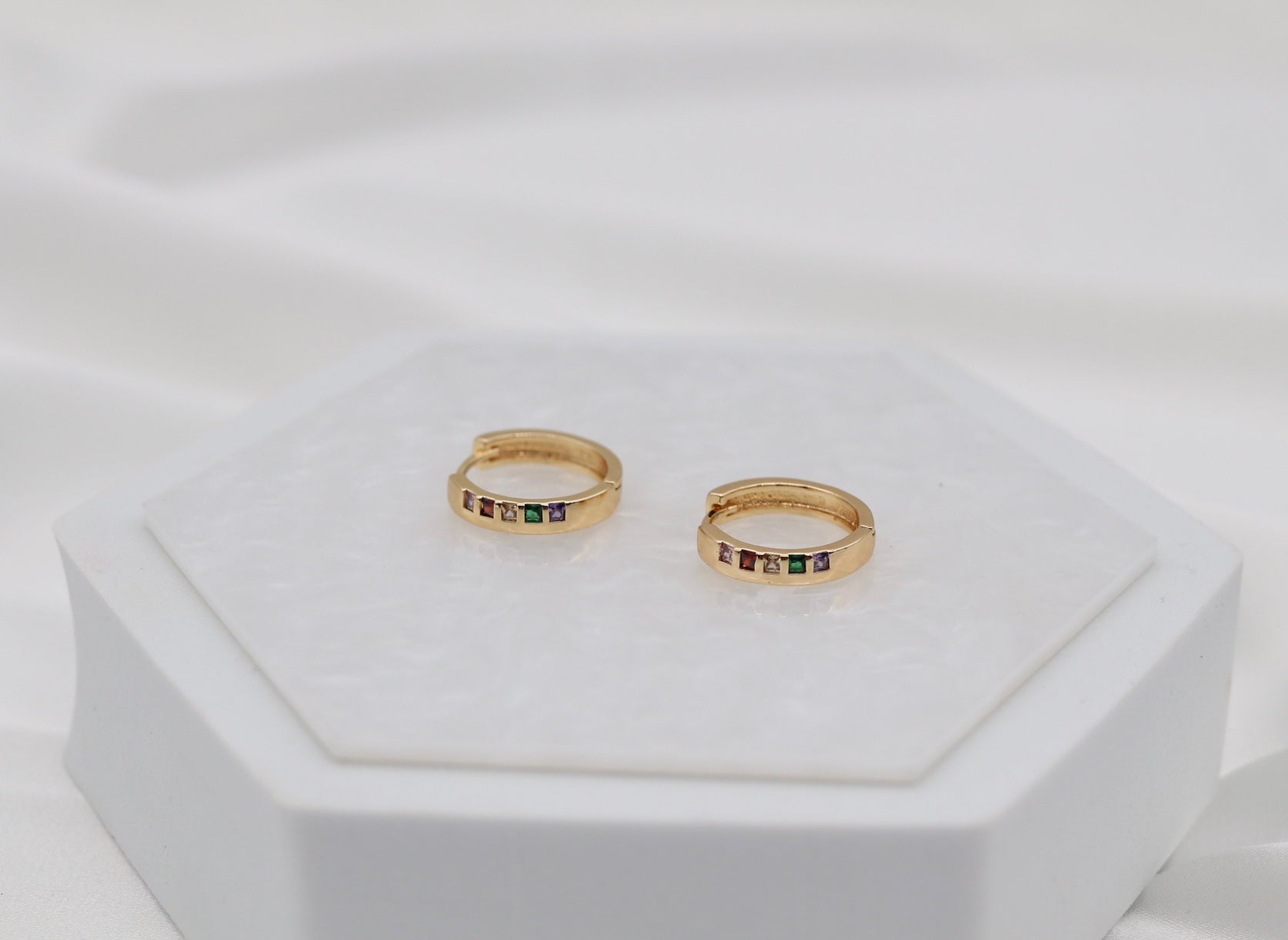 Add a pop of color to your everyday look with these stunning gold huggie hoop earrings, featuring a row of vibrant multi-color square-cut crystals. Designed for effortless style and comfort, these sleek hoops blend modern elegance with playful color, making them perfect for daily wear or layering with other earrings. Lightweight, eye-catching, and versatile, they’re a must-have statement staple for any jewelry collection.