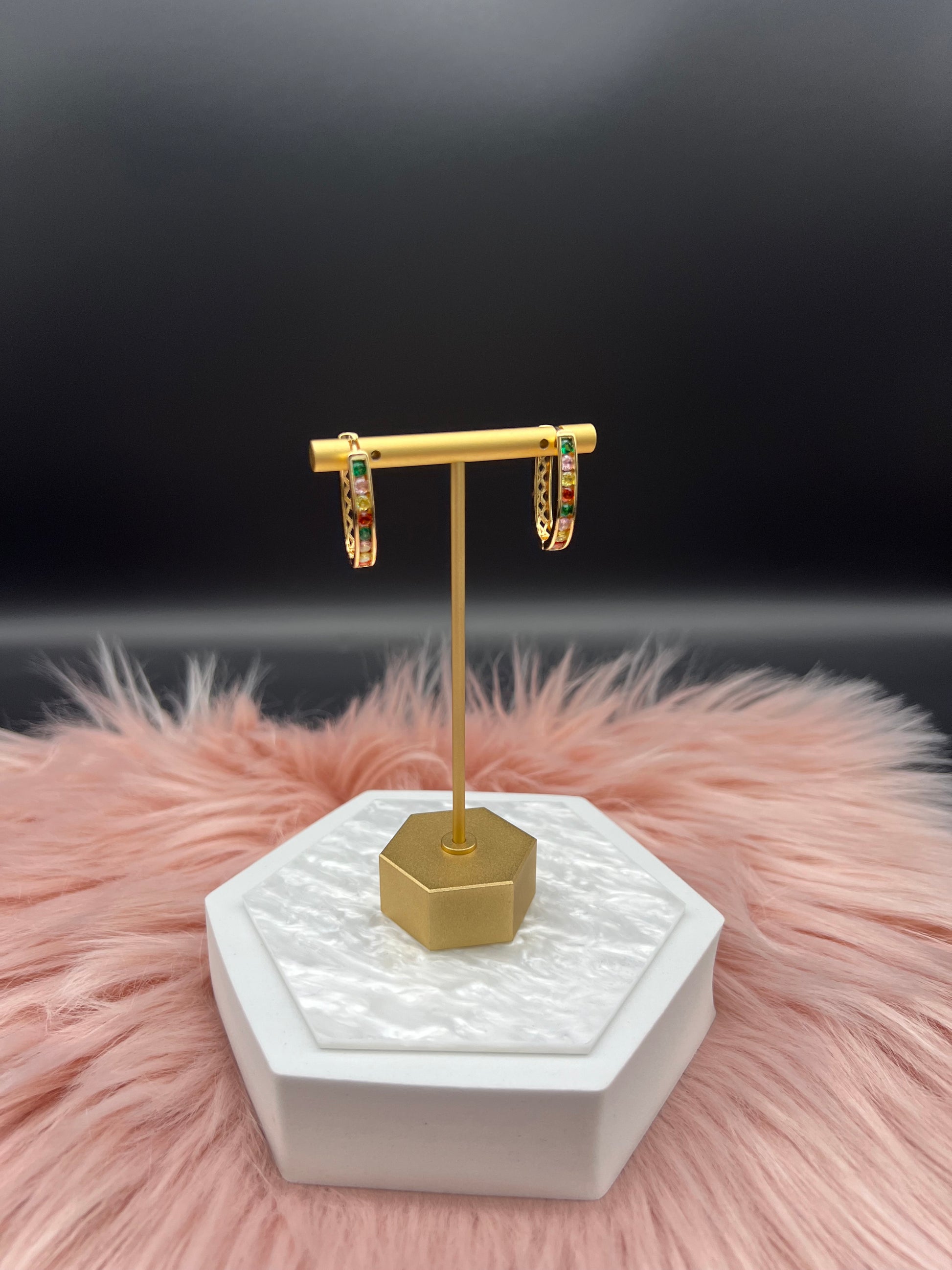 Rainbow sapphire huggie earrings are small, close-fitting hoops adorned with a series of multi-colored sapphires arranged in a vibrant rainbow sequence. These earrings hug the earlobe gracefully and shimmer with a spectrum of colors, ranging from deep blues to lively pinks, offering a playful yet elegant appeal.