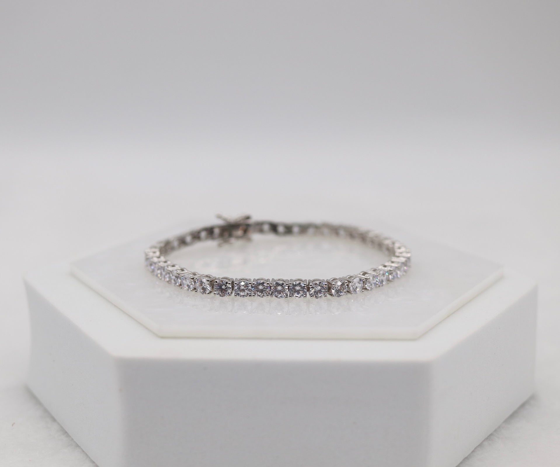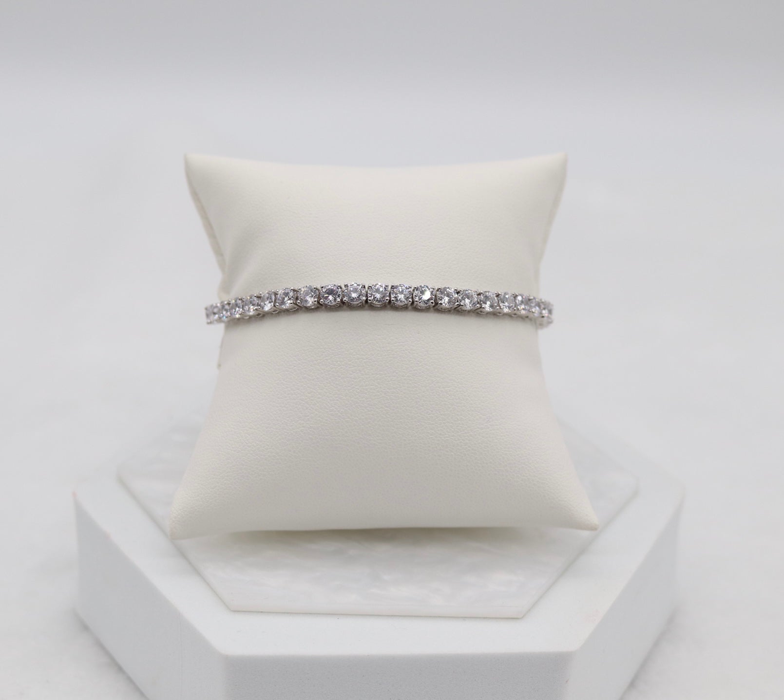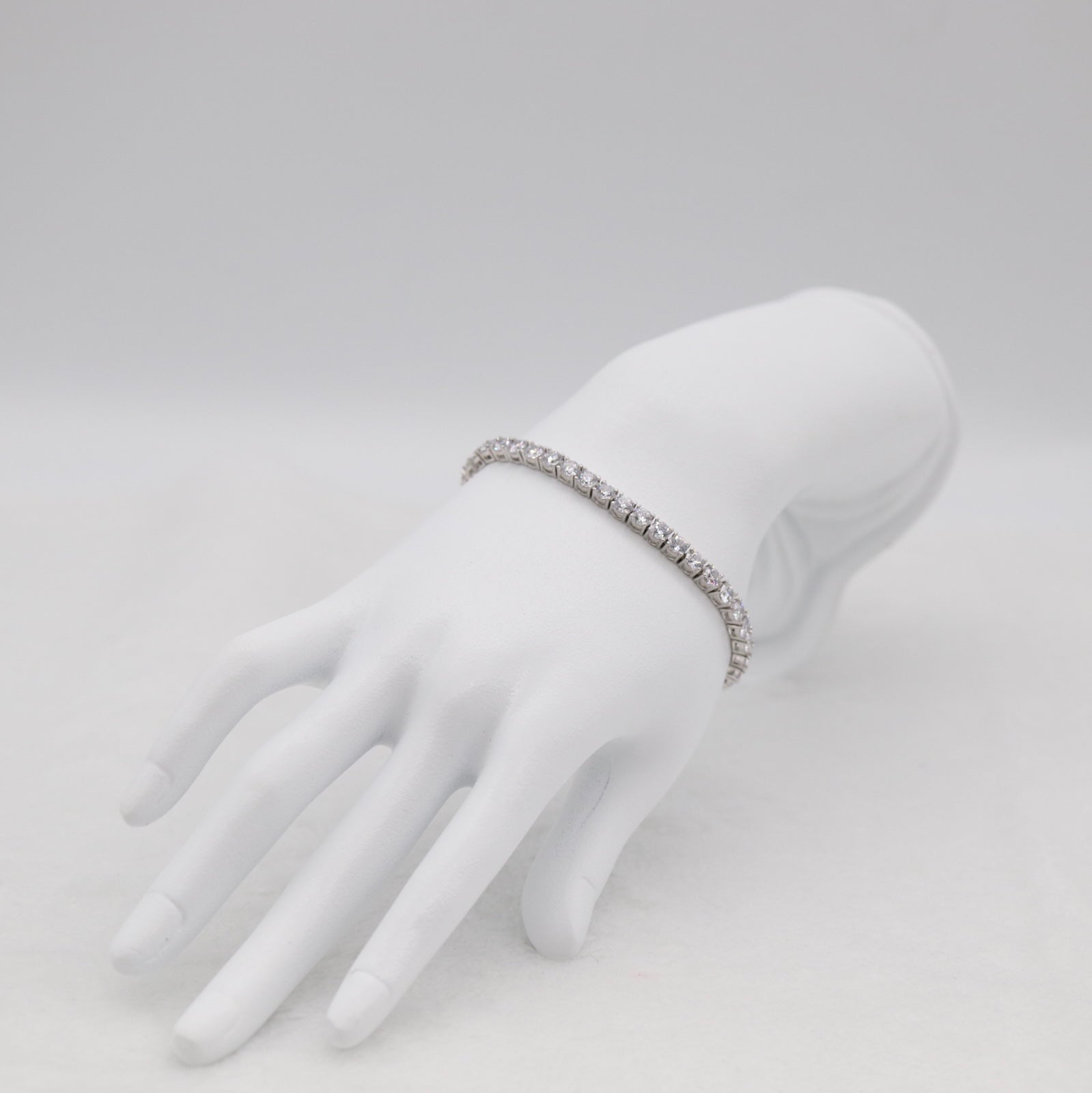 This classic tennis bracelet features a continuous row of brilliant round-cut cubic zirconia stones set in a sleek silver finish. Its timeless sparkle makes it the perfect accessory for both everyday elegance and special occasions.