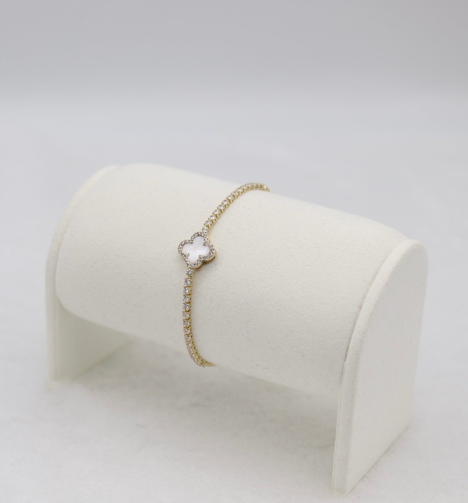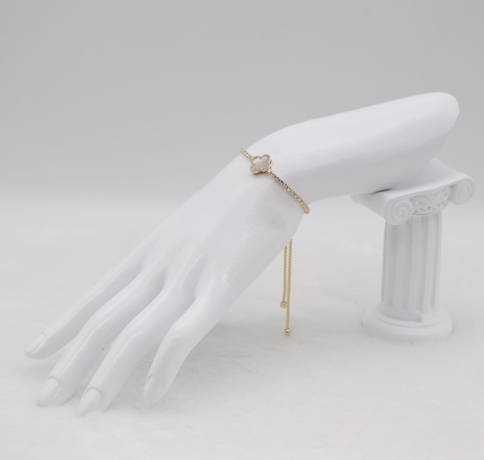 This elegant adjustable bracelet features a sparkling row of cubic zirconia stones with a gold clover centerpiece for a timeless touch of charm. Designed with a sliding clasp for a perfect fit, it’s a versatile piece that transitions effortlessly from day to night.