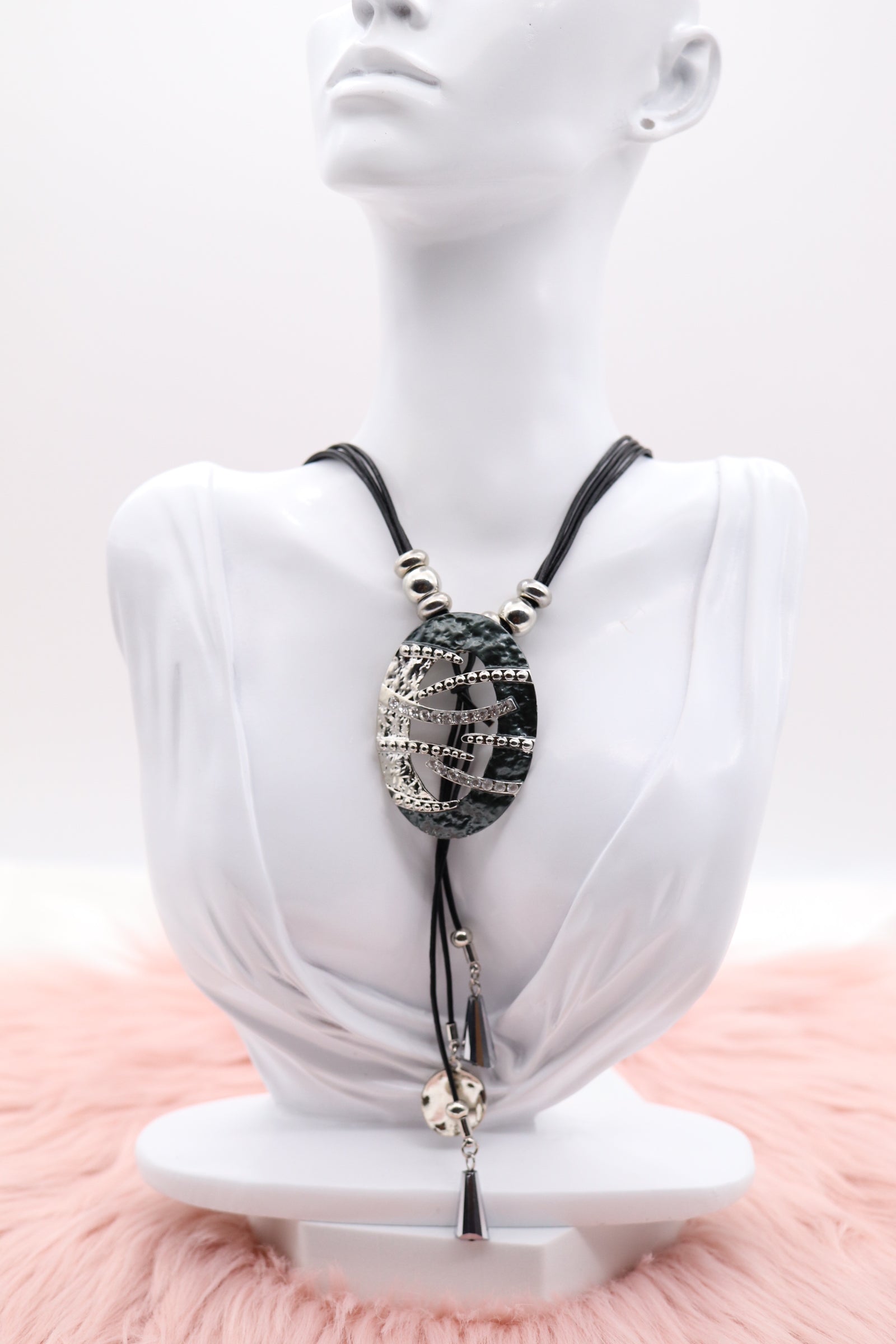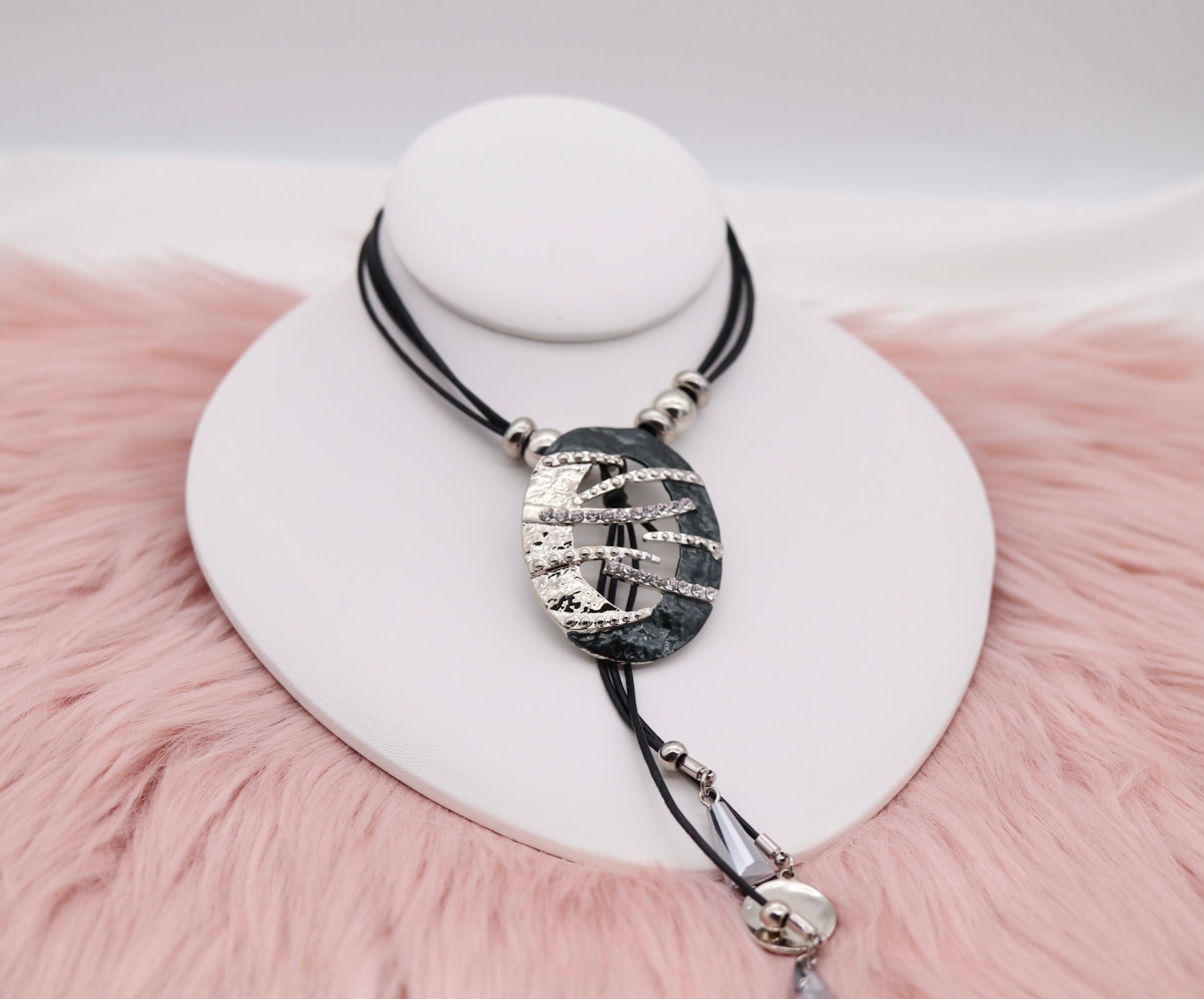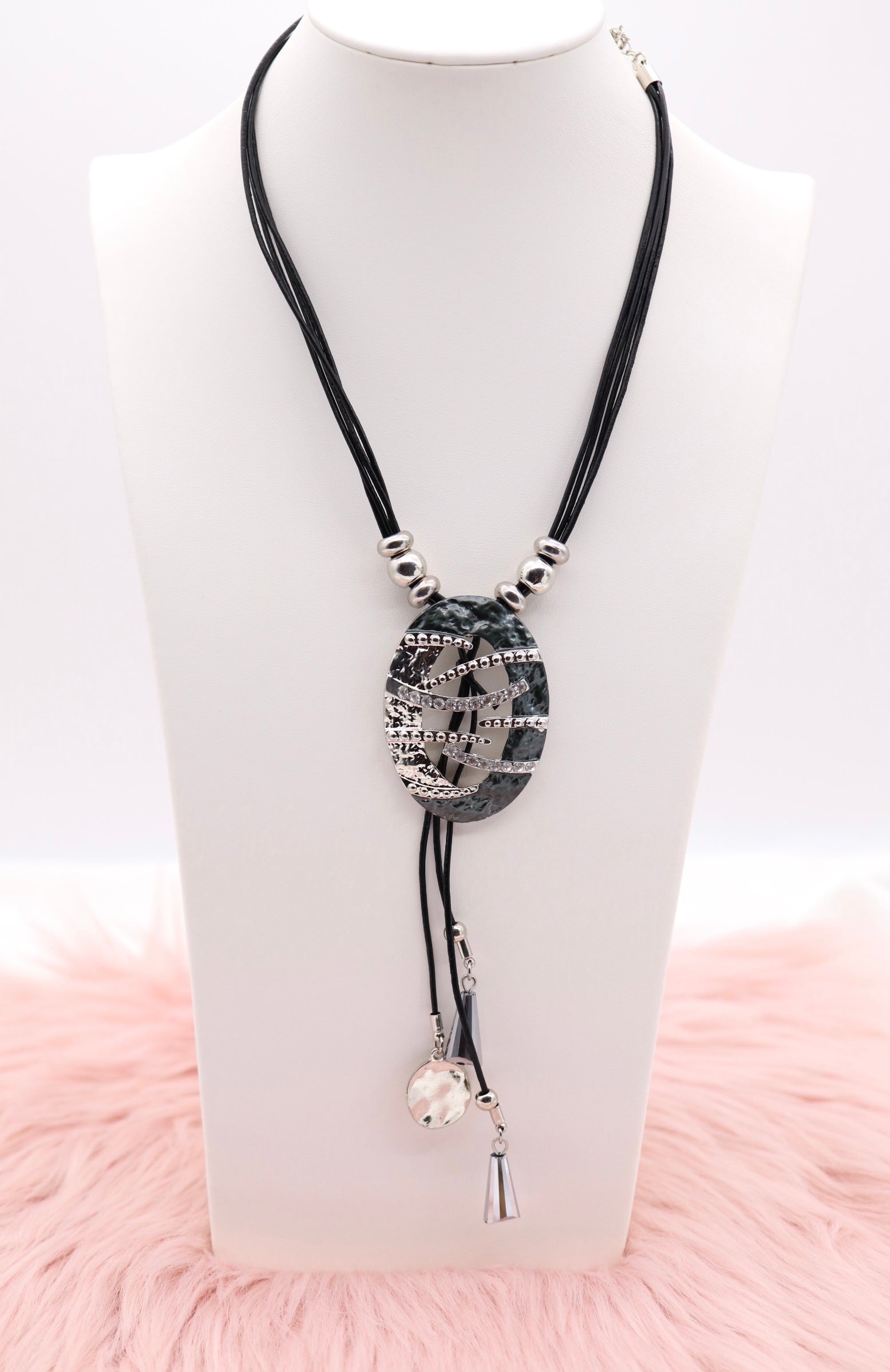 Metallic Black and Silver Pendant With Dangling Stones and Multi Black Rope Necklace