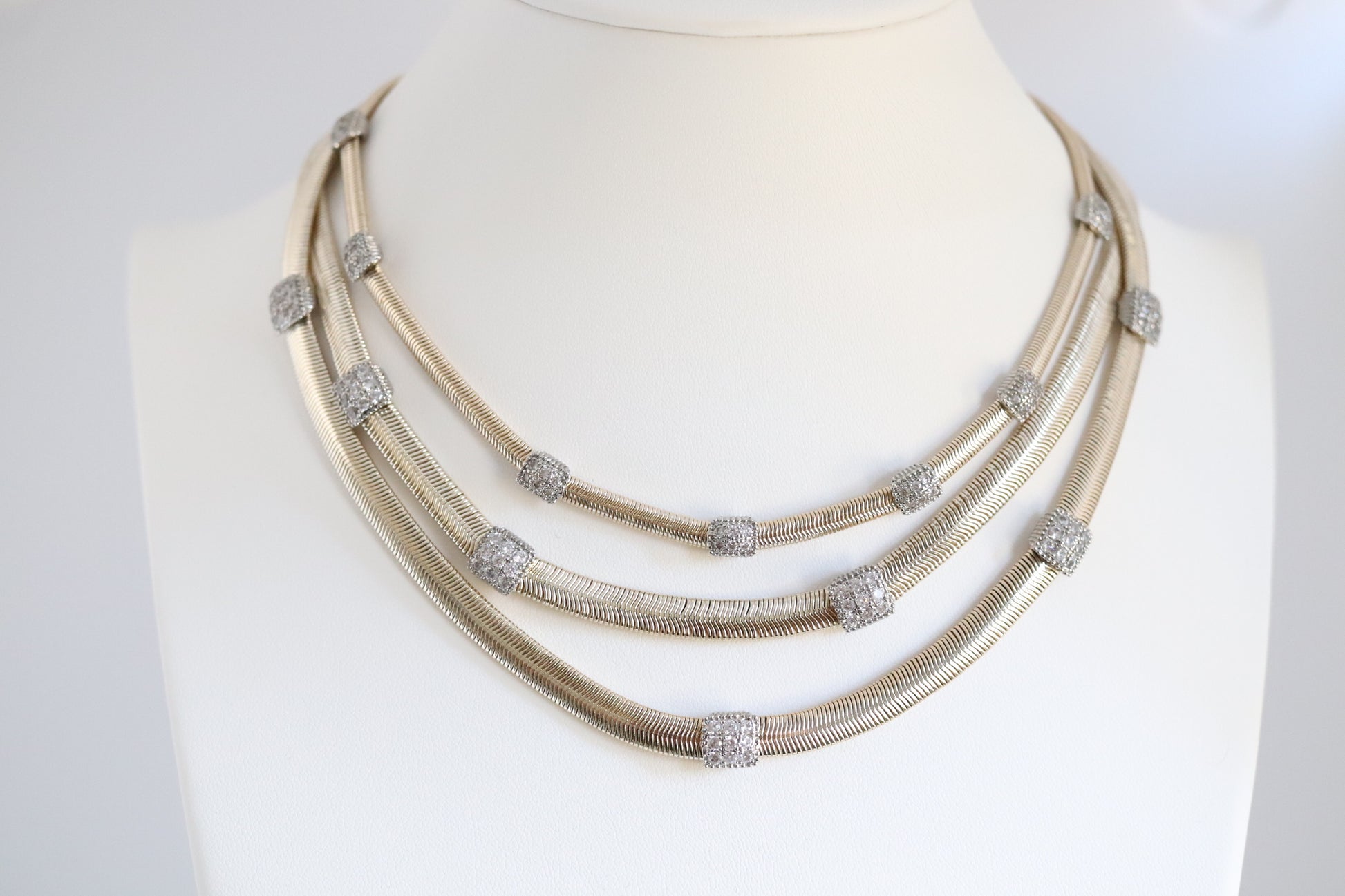 The Gold Snake Layered Necklace with CZ Stations is a sophisticated piece, showcasing a serpent-inspired chain with intricate detailing. Adorned with cubic zirconia stations, it adds a touch of sparkle to the multi-layered design, making it a stylish and eye-catching accessory.