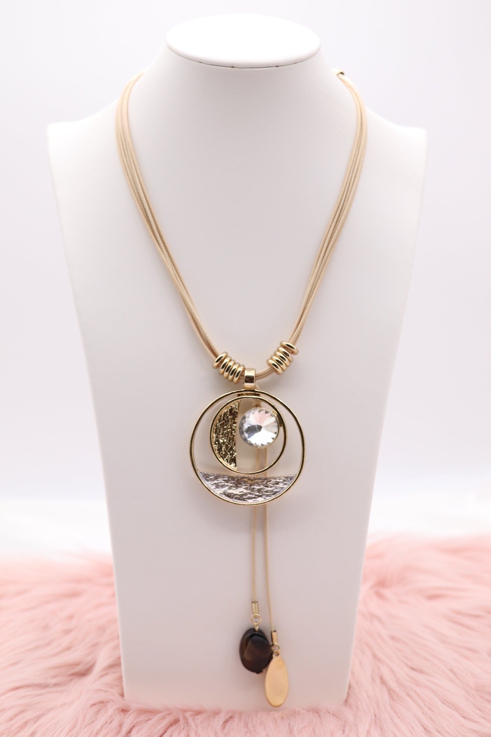 Gold Metallic Circle Pendant With Clear Stone, Multi Light Tan Rope Necklace