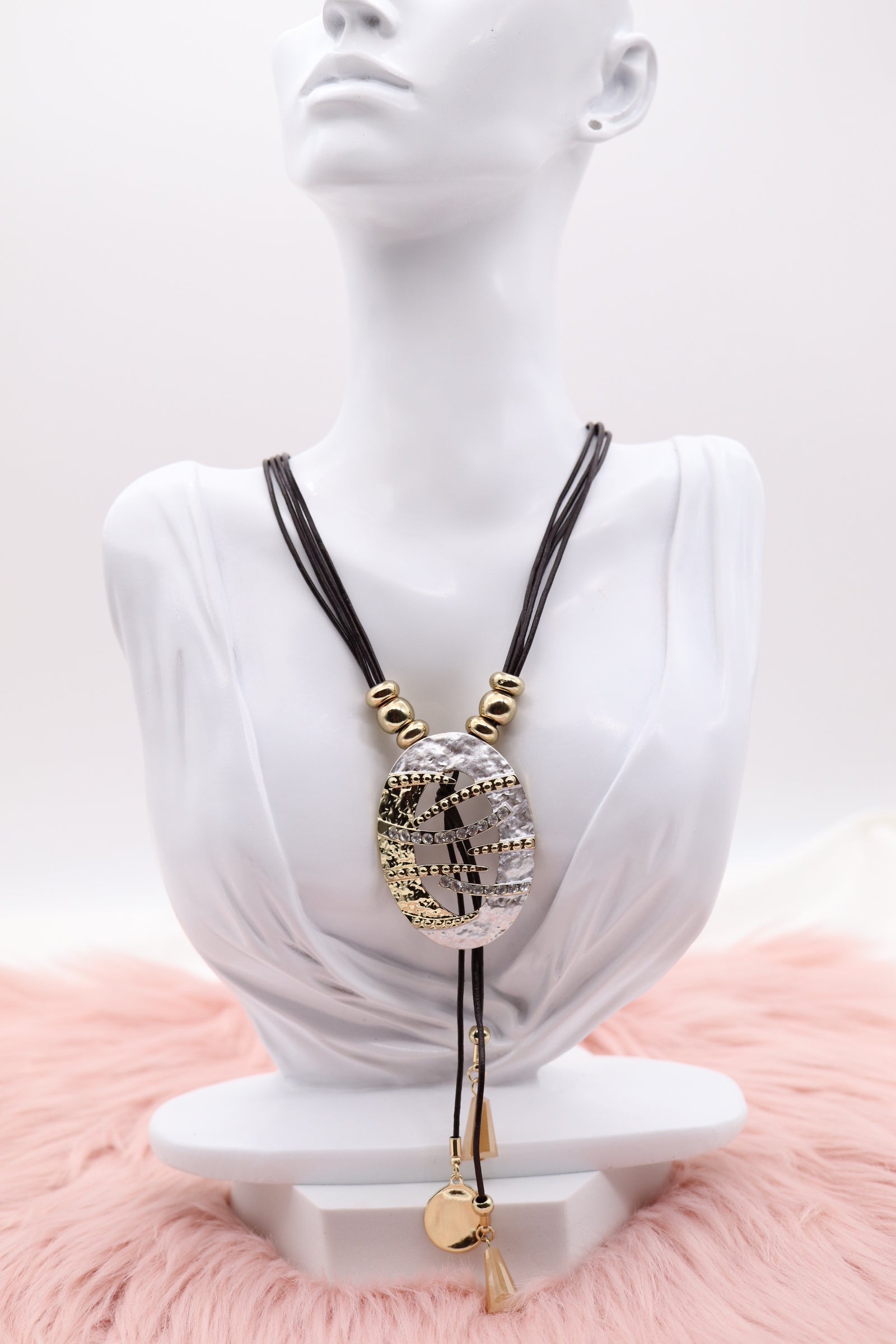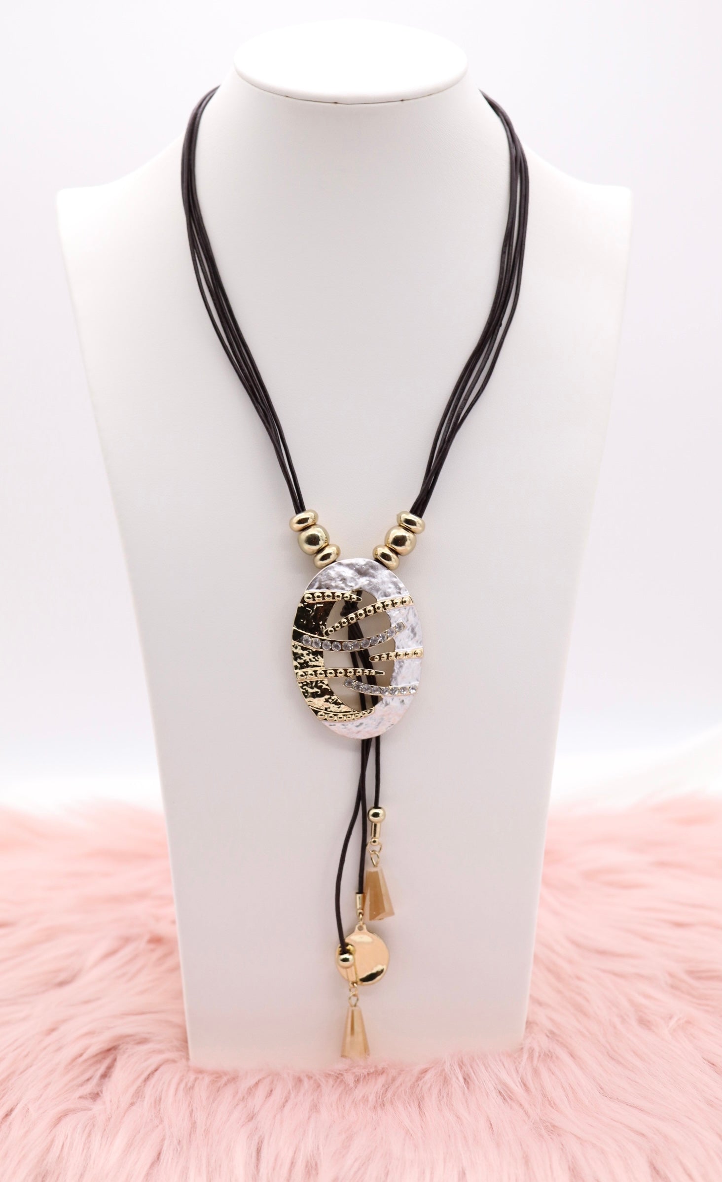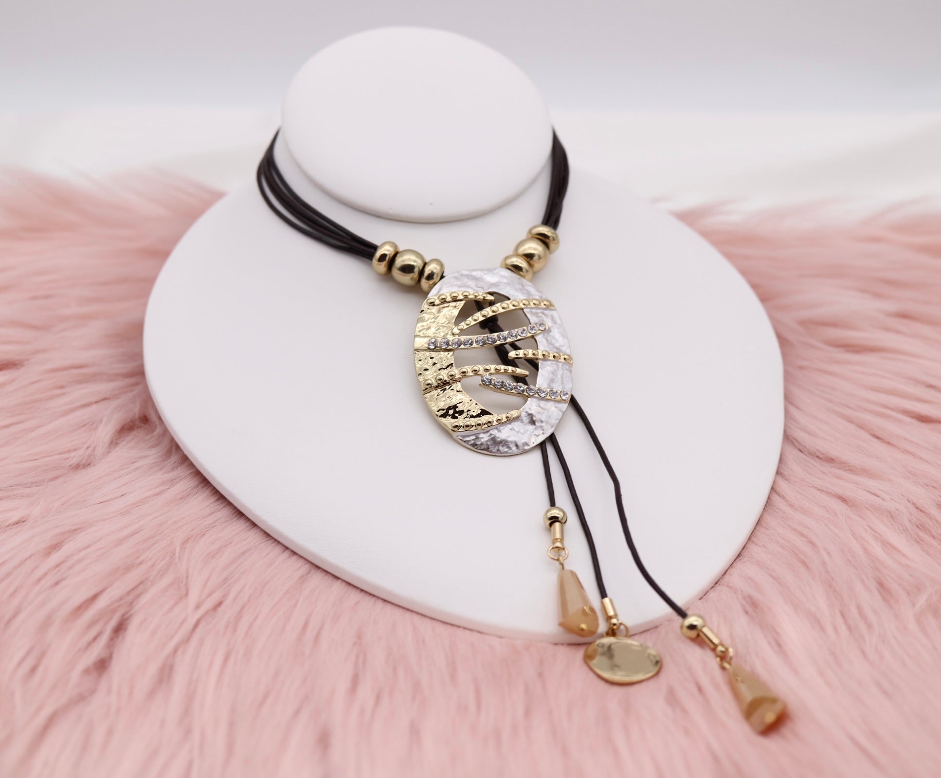 Metallic Gold and Silver Pendant With Dangling Stones and Multi Black Rope Necklace