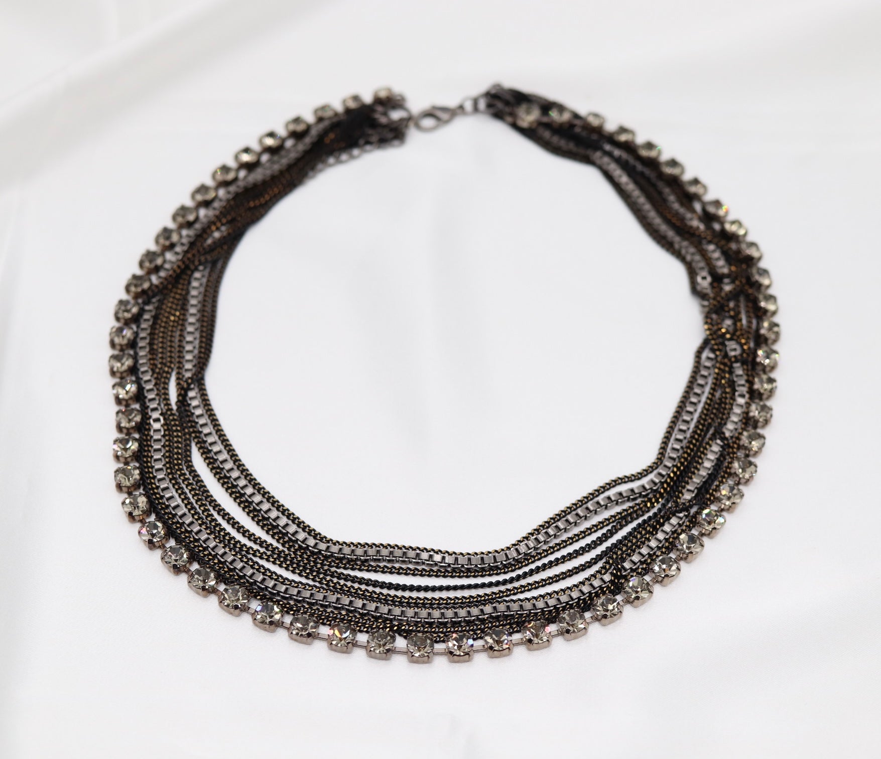 Turn heads with this dramatic smoky crystal statement necklace featuring layered gunmetal chains and faceted crystal accents. Each strand cascades beautifully to create a bold, dimensional look that’s both edgy and elegant. Perfect for elevating any outfit — from a little black dress to a simple blouse.