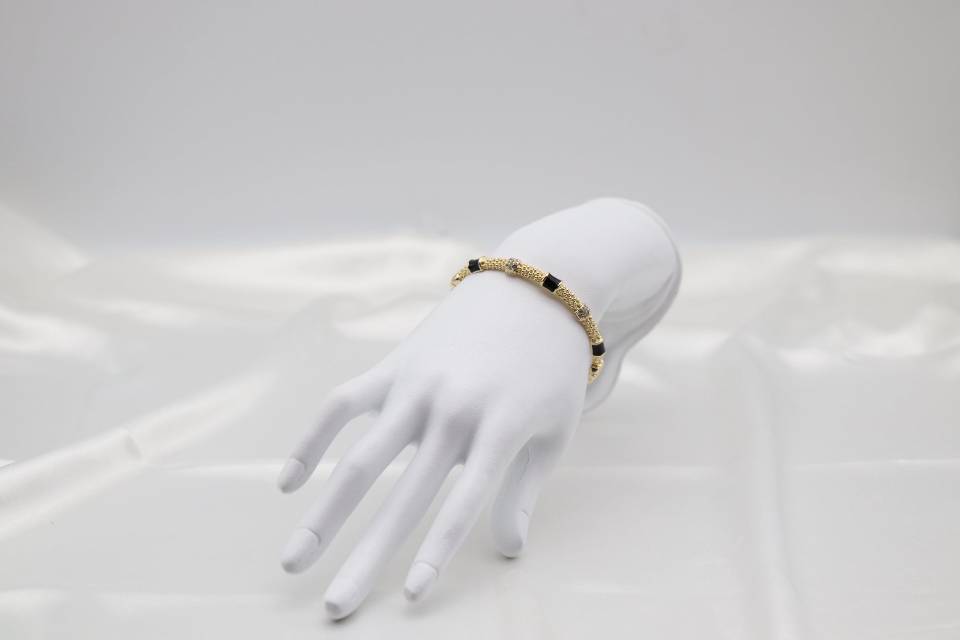 Elevate your everyday style with this Black Enamel & Crystal Gold Beaded Bangle Bracelet, a sophisticated piece designed to add subtle sparkle to any outfit. This elegant gold bangle features textured gold bead detailing, sleek black enamel accents, and shimmering crystal stations that create a beautiful balance of modern style and timeless elegance. Perfect for stacking with other bracelets or wearing alone, this versatile bangle transitions effortlessly from day to night. The refined design makes it an ideal accessory for work, special occasions, or everyday wear.