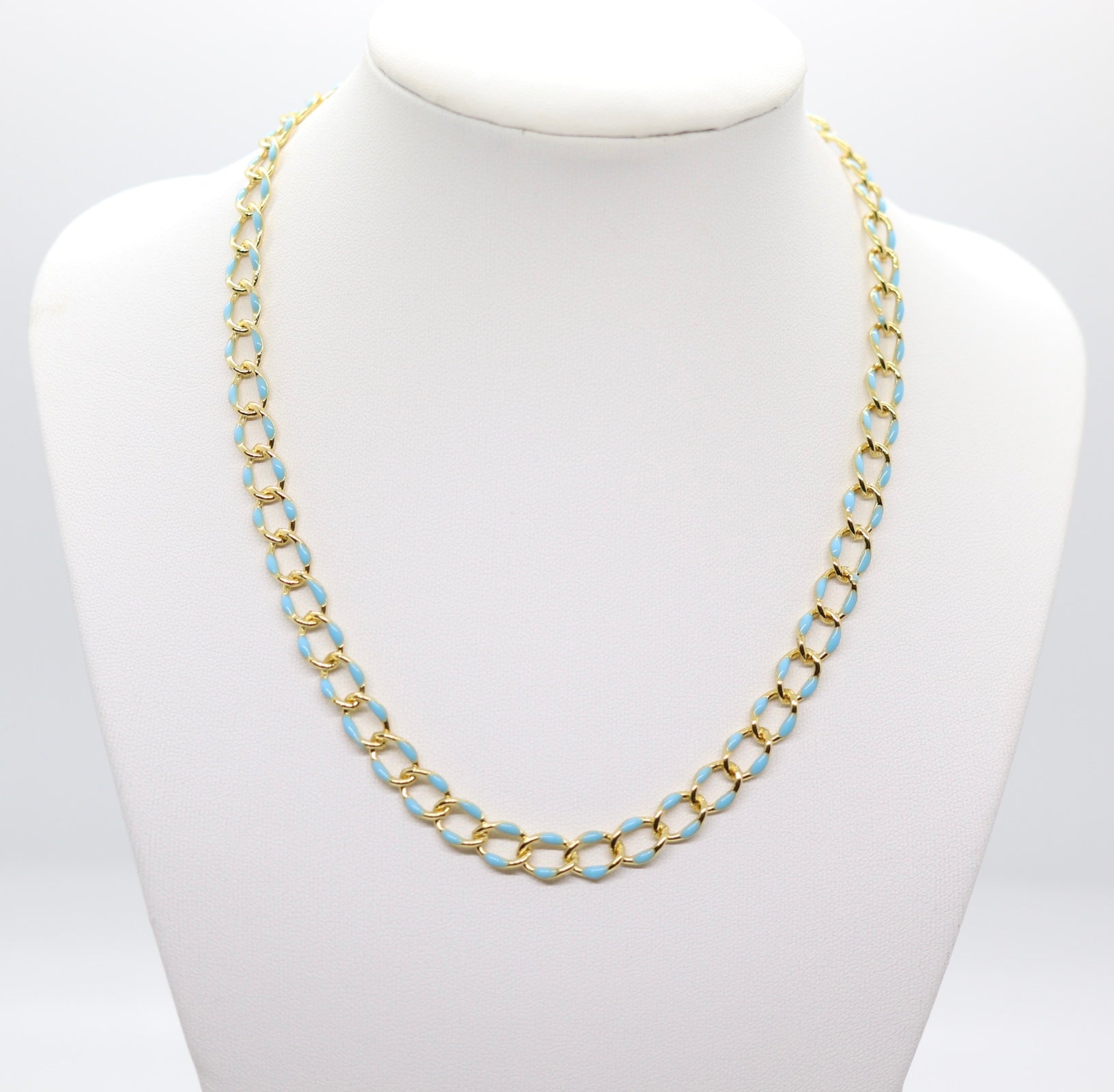 The Light Blue and Gold Chain Link Necklace is a striking piece of jewelry, featuring a series of large, interlocking links in a beautiful light blue color, contrasted with elegant gold accents. This necklace combines a bold, contemporary design with a touch of classic elegance, making it a versatile accessory for both casual and formal occasions.