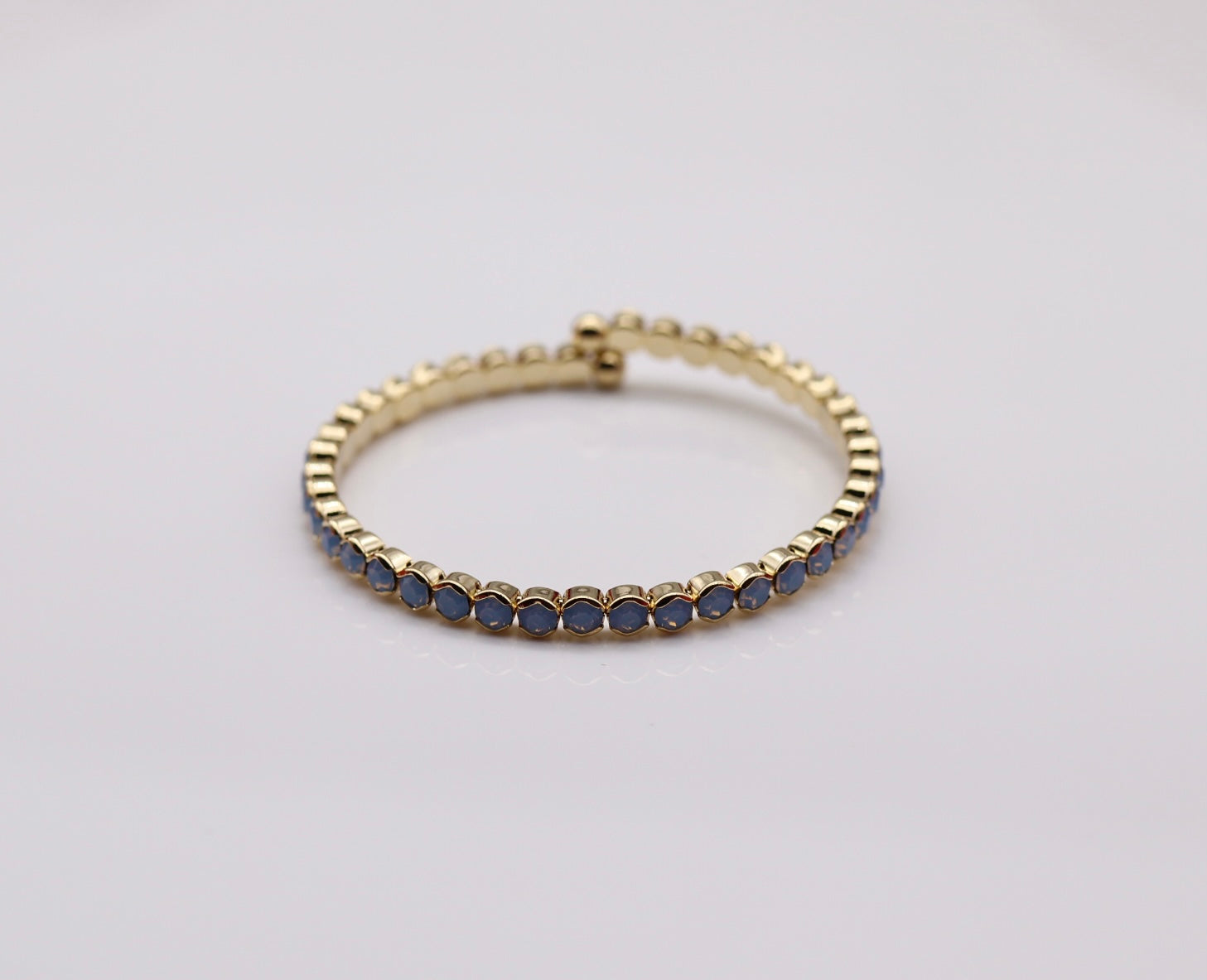 This bracelet is made with blue opal and gold metal. It is 2 1/2 inches long and 3/16 inches thick. It is made with rhinestones, and is lead and nickel free.