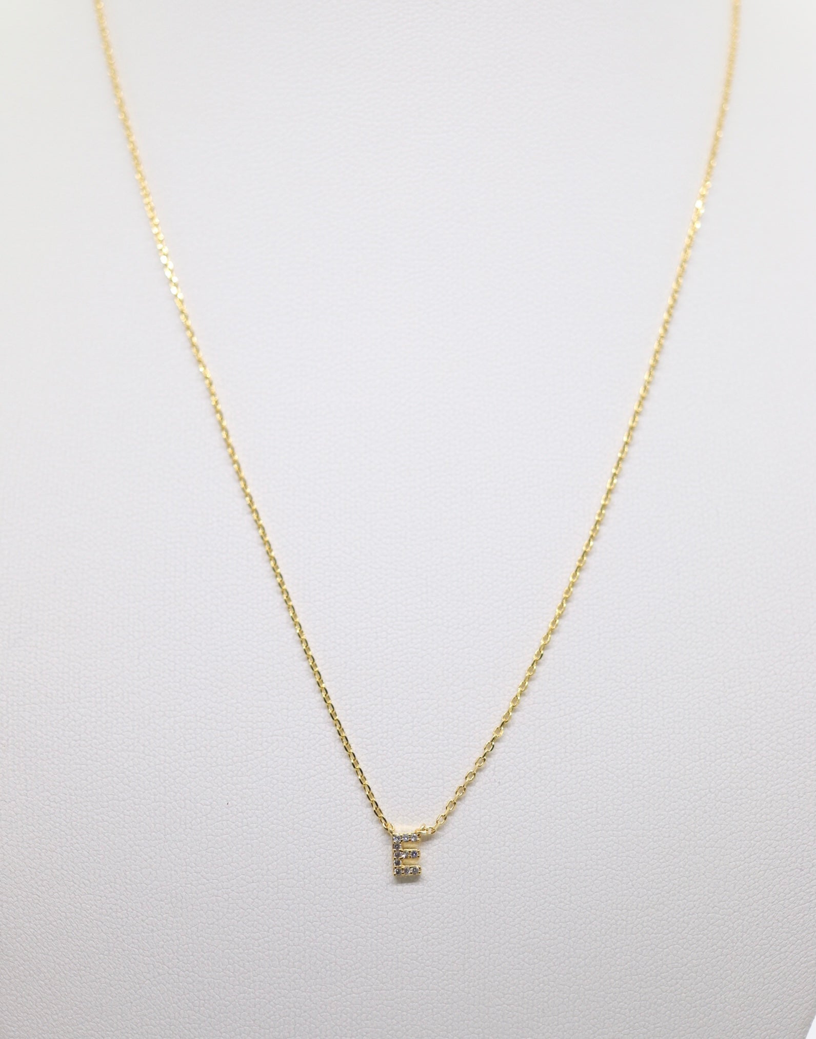 The Gold Mini Pave Initial Necklace (E) is a delicate and stylish accessory, featuring a small, gold pendant of the initial "E" encrusted with miniature pave-set stones for a subtle sparkle. This necklace combines the elegance of gold with a personal touch, making it a perfect piece for everyday wear or as a thoughtful gift.