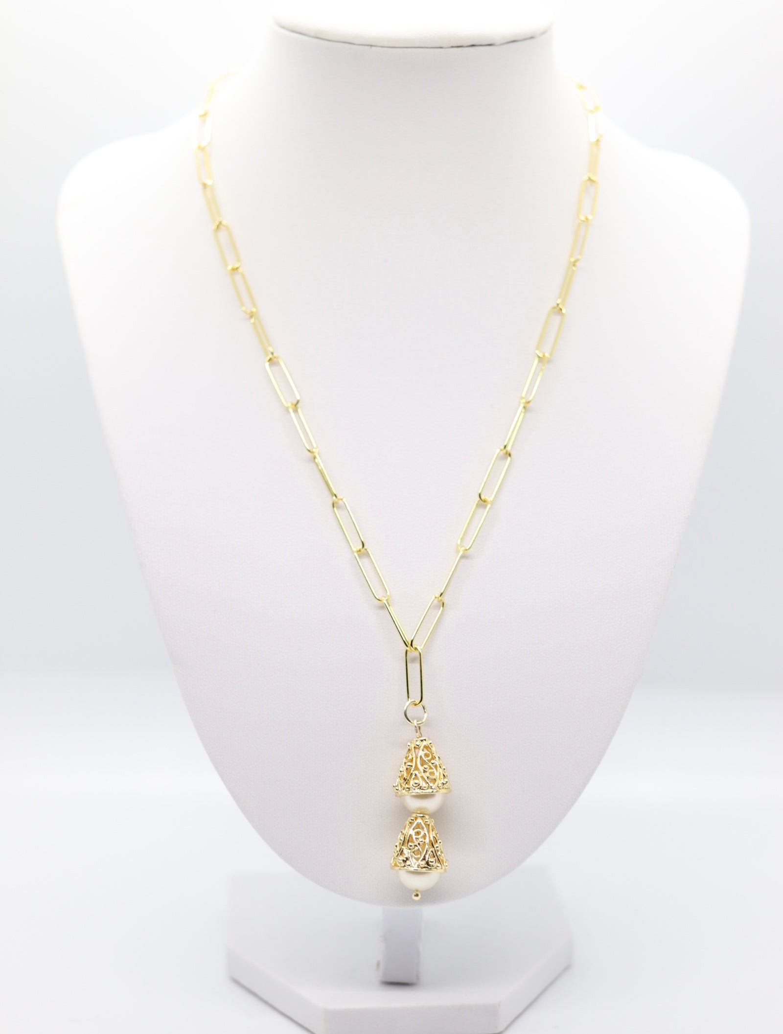Gold Paperclip Chain with Filigree Decore Double Pearl Pendant