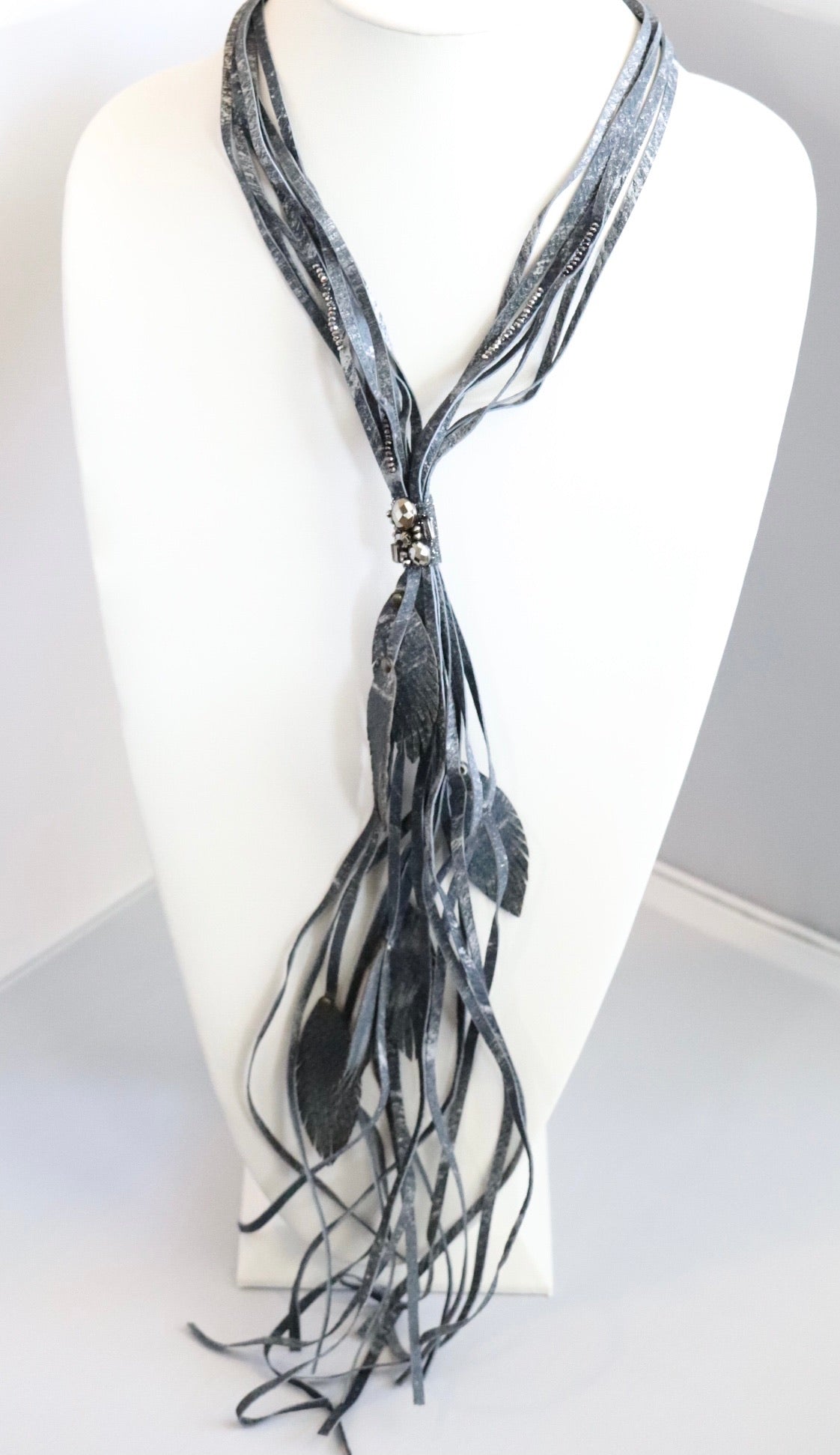 The long blue feathered tasseled leather necklace showcases an intricate design with cascading blue feathers and tassels, creating a unique and bohemian aesthetic. This statement piece, crafted from leather, offers a blend of natural textures and vibrant color, perfect for adding a bold touch to any ensemble.
