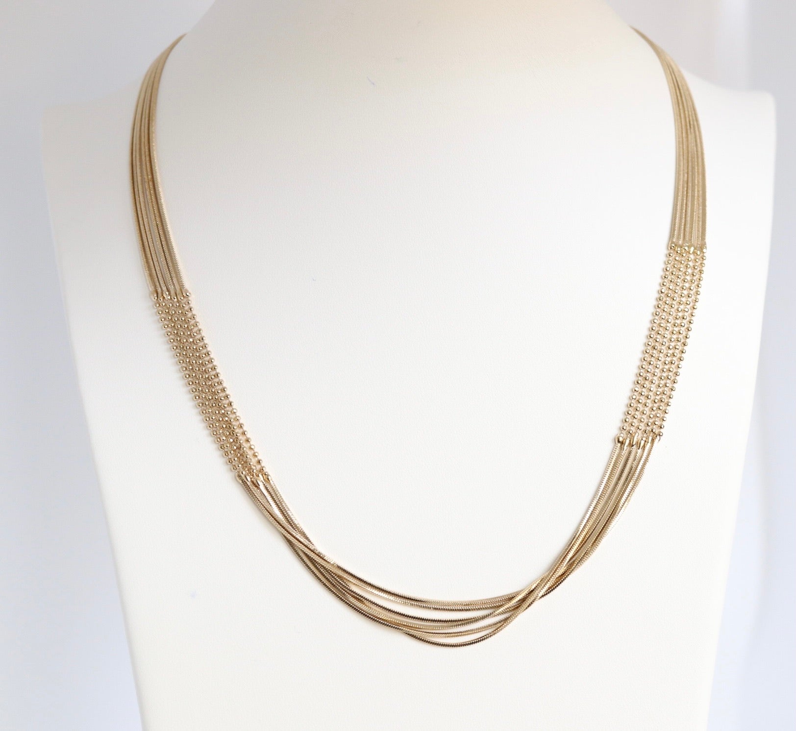 The elegant gold layered necklace boasts a sophisticated design with beaded sections on both sides, adding a touch of refinement and charm. Its multi-layered structure creates a statement piece that gracefully enhances any neckline, making it a versatile and eye-catching addition to your jewelry collection.